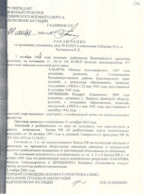 1. г. Хабаров Михаил Александрович, 1907 года рождения, уроженец дер. Симановщина, Большемуртинского района Красноярского края, проживавший в фактории Палигус, Байкитского района Национально-Эвенковского округа, русский, гр-н СССР, из крестьян, служащий, женат, с низшим образованием, беспартийный, со слов не судим, в РККА мобилизован в мае месяце 1942 года, быв. красноармеец 577 отдельной кабельно-шестовой роты связи;