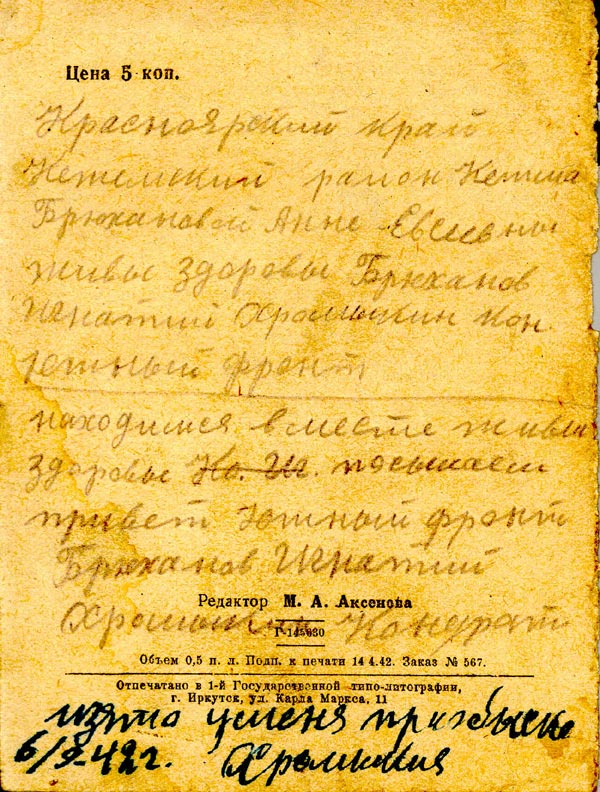 Состав семьи: жена Брюханова Анна Евсеевна 1900 года рождения, дочь Вера – 16 лет. Проживают в селе Кежма, жена работает в колхозе «Заветы Ильича»