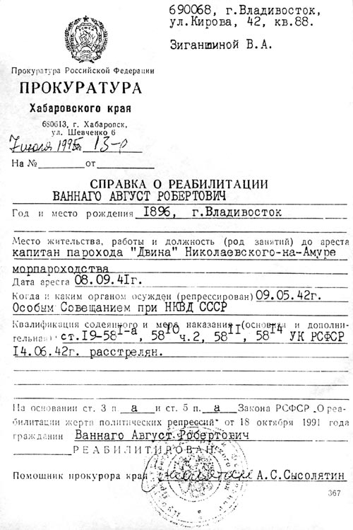 По доносу помполита, которому он не доверял на почве его политической безграмотности и с которым у него были разногласья по политическим взглядам, капитану Ваннаго был вынесен приговор – расстрел.