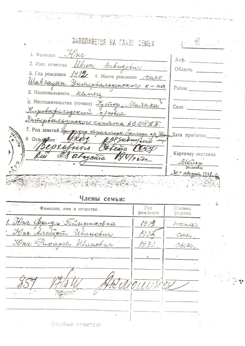 ЮНГ Иоганнес (Иван) Давыдович, 1912-1942, немец, уроженец с. Шавгаузен Унтервальдского кантона Саратовской обл. Бригадир тракторной бригады колхоза на хуторе Маянка. 30.08.1941 с семьей: жена Фрида Гейнриховна (Андреевна), 1913 г.р., дети Альфред (Альберт), 1935 г.р., Рихард, 1939 г.р., депортированы в с. Кома Новоселовского р-на КК. 17.12.1941 родилась дочь Ирма, в замужестве Юферева. 16.02.1942 прибыл по трудовой мобилизации Новоселовским РВК КК в Вятлаг. Работал на лесоповале. 12.06.1942 умер в лагере. Семья реабилитирована в 1996.
