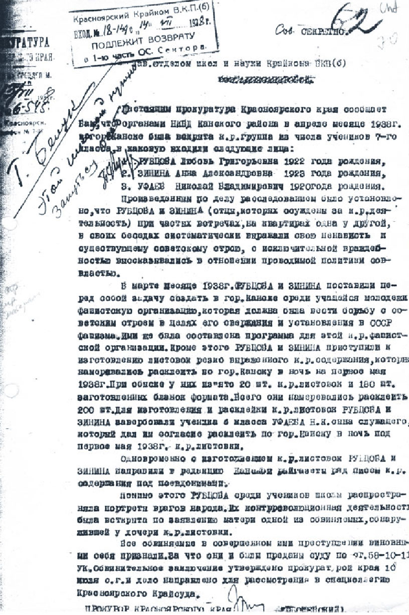 Настоящим прокуратура Красноярского края сообщает Вам, что органами НКВД Канского района в апреле месяце 1938г. в гор.Канске была вскрыта к.р.группа из числа учеников 7-го класса в каковую входили следующие лица: