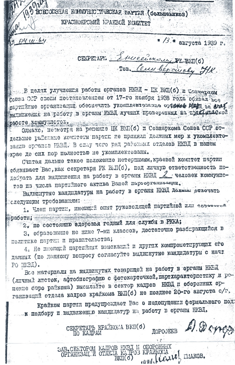 Считая дальше такое положение нетерпимым, краевой комитет партии обязывает Вас, как секретаря РК ВКП(б), под личную ответственность подобрать для выдвижения на работу в органы НКВД 2 человек коммунистов из числа партийного актива Вашей парторганизации.