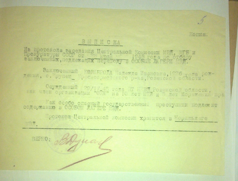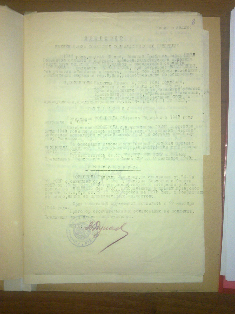 Осуждена 29.04.45 г. ВТ войск НКВД Ровенской обл.,