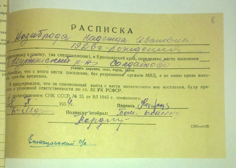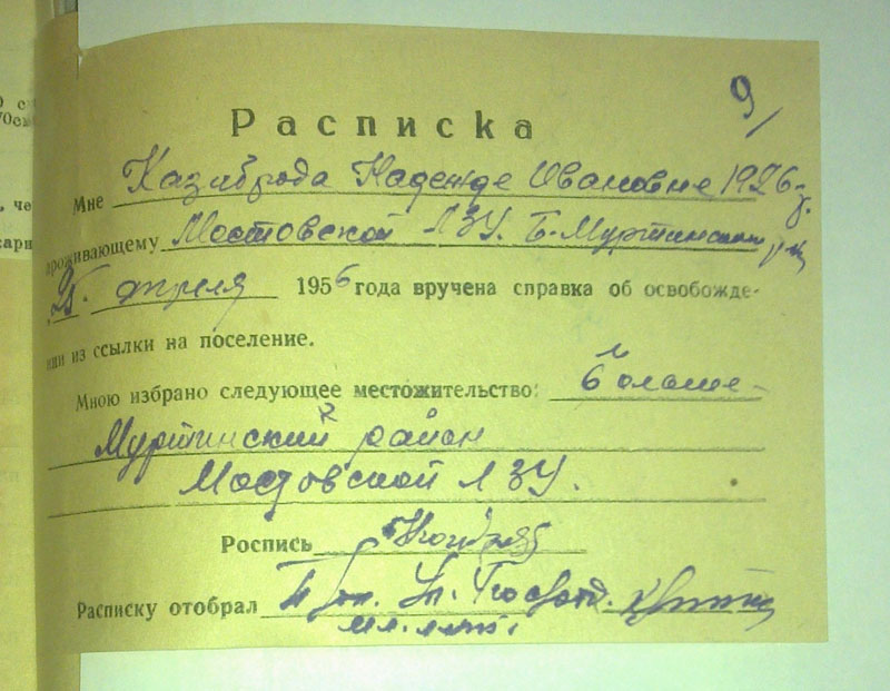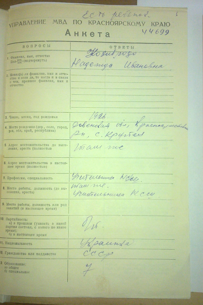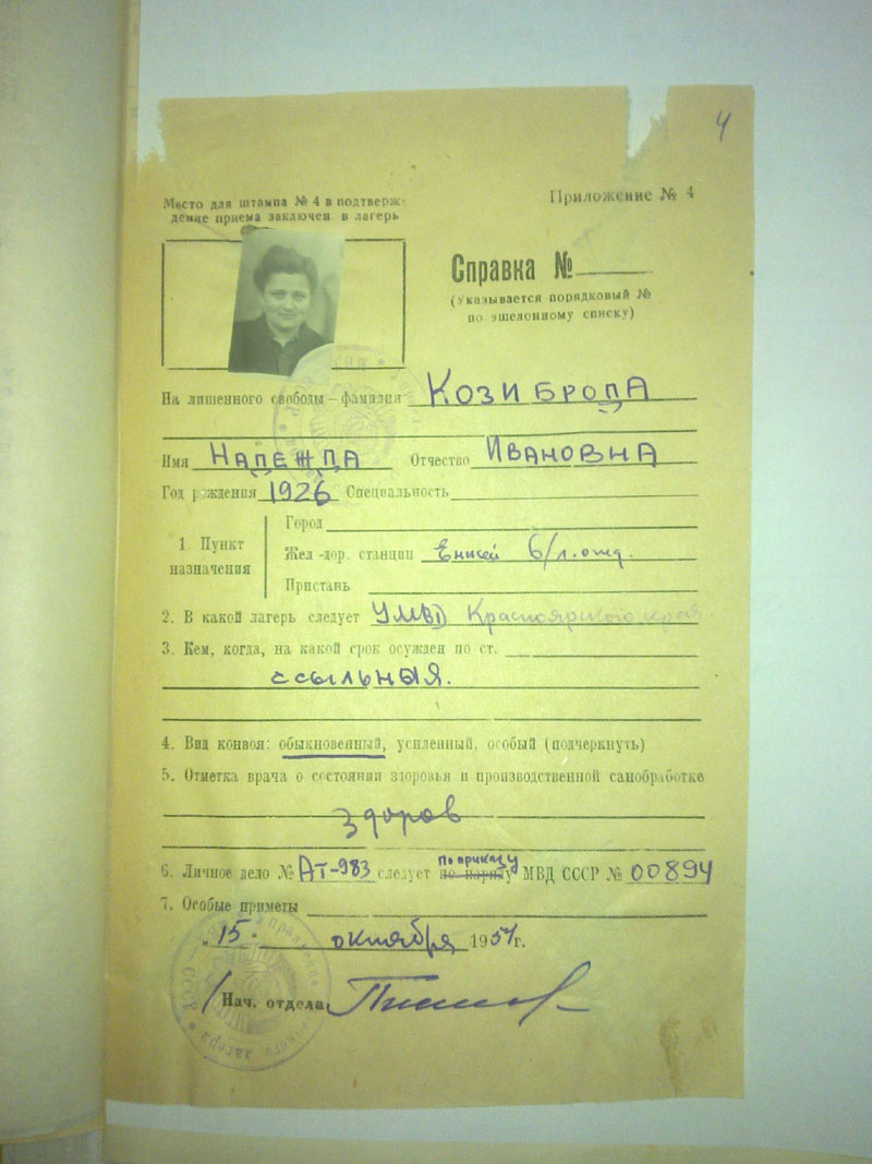 Убыла 26.09.53 г. в ОЗЕРЛАГ. <конец данных учётной