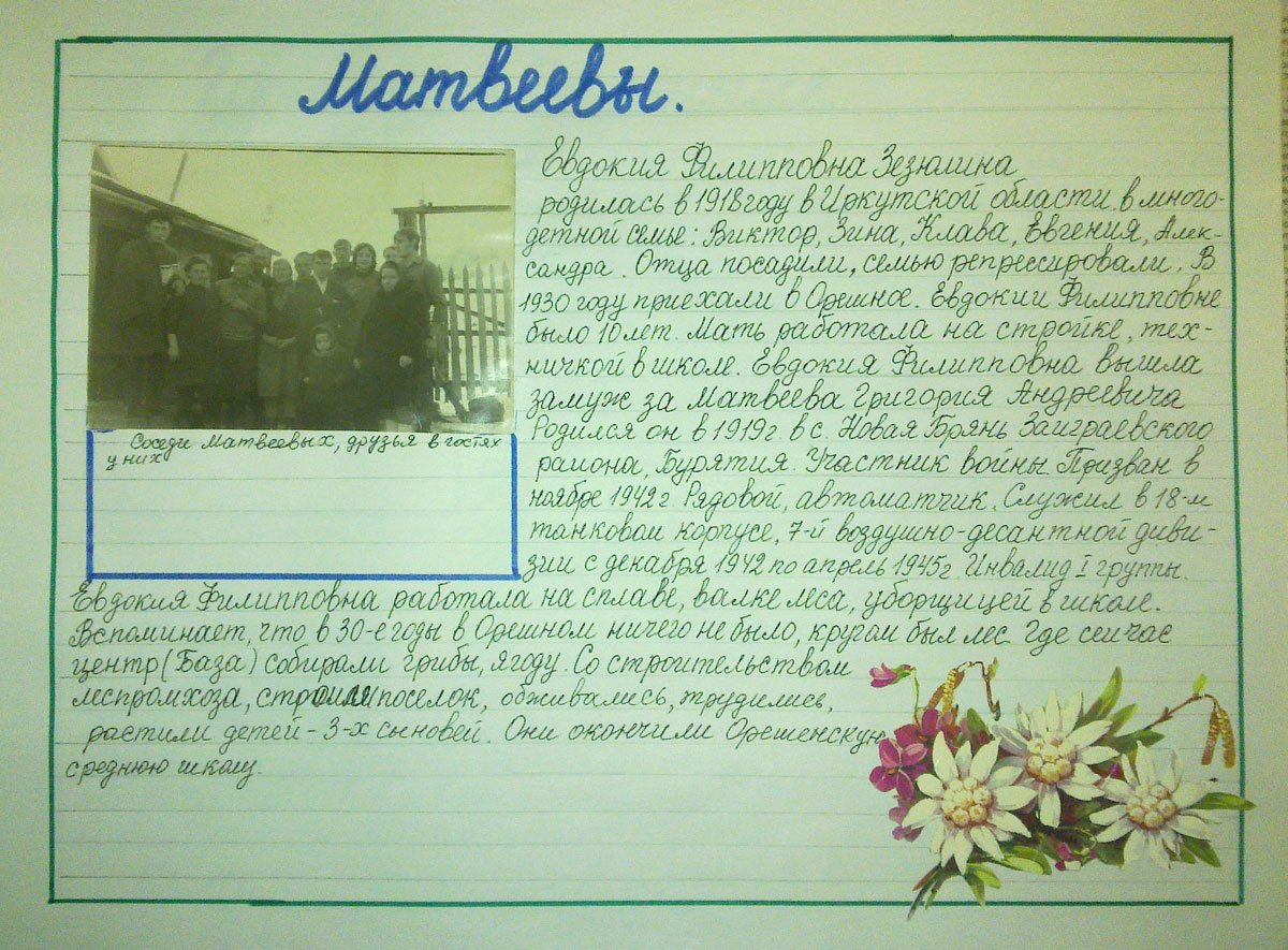 Евдокия Филипповна Зезюлина родилась в 1918 году в Иркутской области в многодетной семье: Виктор, Зина, Клава, Евгения, Александра. Отца посадили, семью репрессировали. В 1930 году приехали в Орешное. Евдокии Филипповне было 10 лет. Мать работала на стройке, техничкой в школе. Евдокия Филипповна вышла замуж за Матвеева Григория Андреевича. Родился он в 1919 году в с. Новая Брянь Заиграевского района, Бурятия. Участник войны. Призван в ноябре 1942 г. Рядовой, автоматчик. Служил в 18-м танковом корпусе, 7-й воздушно-десантной дивизии с декабря 1942 по апрель 1945 г. Инвалид I группы. Евдокия Филипповна работала на сплаве, валке леса, уборщицей в школе. Вспоминает, что в 30-е годы в Орешном ничего не было, кругом был лес. Где сейчас центр (База) собирали грибы, ягоду. Со строительством леспромхоза, строили поселок, обживались, трудились, растили детей – 3-х сыновей. Они окончили Орешенскую среднюю школу.