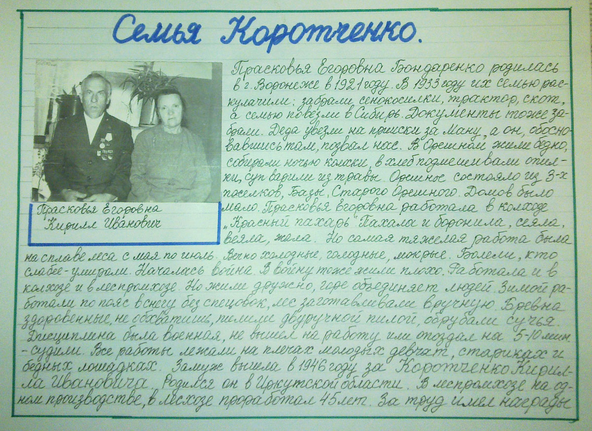 Прасковья Егоровна Бондаренко родилась в г. Воронеже в 1921 году. В 1933 году их семью раскулачили: забрали сенокосилки, трактор, скот, а семью повезли в Сибирь. Документы тоже забрали. Деда увезли на прииск за Ману, а он, обосновавшись там, позвал нас. В Орешном жили бедно, собирали ночью колоски, в хлеб подмешивали опилки, суп варили из травы. Орешное состояло из 3-х поселков, Базы, Старого Орешного. Домов было мало. Прасковья Егоровна работала в колхозе «Красный Пахарь». Пахала и боронила, сеяла, веяла, жала. Но самая тяжелая работа была на сплаве леса с мая по июль. Вечно холодные, голодные, мокрые. Болели, кто слабее – умирали. Началась война. В войну тоже жили плохо. Работала и в колхозе и леспромхозе. Но жили дружно, горе объединяет людей. Зимой работали по пояс в снегу без спецовок, лес заготавливали вручную. Бревна здоровенные, не обхватишь, пилили двуручной пилой, обрубали сучья. Дисциплина была военная, не вышел на работу или опоздал на 5 – 10 мин. – судили. Все работы лежали на плечах молодых девчат, стариках и бедных лошадках. Замуж вышла в 1946 году за Коротченко Кирилла Ивановича. Родился он в Иркутской области. В леспромхозе на одном производстве, в лесхозе проработал 45 лет. За труд имел награды орден, медаль, значок «Ударник пятилеток», много грамот. У них 3-е детей. Раиса, Леонид, Сергей, у всех по двое детей – дочь и сын. 3-и внука 3-и внучки. Внуков любят. Одна внучка вышла замуж за Боровых. Один внук в Чечне, за него все переживают.