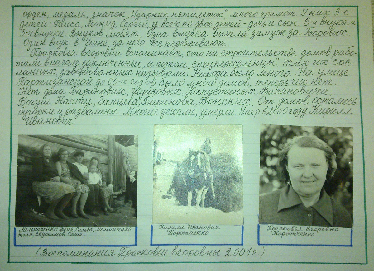 Мария Панадеевна 1902 года рождения, Клементий Дмитриевич 1902 года рождения – наши родители. Мы – Юрий 1935 года, Иван 1938 года рождения – их дети. До выселения в 1942 году, жили в Краснодарском крае Северском районе в станице Ильская. Отца забрали в 1937 году неизестно куда и с тех пор он не вернулся. Спустя много лет матери пришла справка о его реабилитации. Когда в 1942 году нас депортировали, мы с братом были маленькие. Мне – Юре было лет 7, Ване – 4 года. Помню что мы плыли по Каспийскому морю их баку. Ехали долго, не зная куда. Привезли в Орешное, поселили в бараке в Таежном. В комнате 2 – 3 семьи. Мама и тетя Женя – сестра мамы стали работать. Мама пилила дрова. Работая в лесу мама простудилась, заболела и работать уже не могла. Евгения Панадеевна 1905 года рождения была депортирована вместе с нами.
