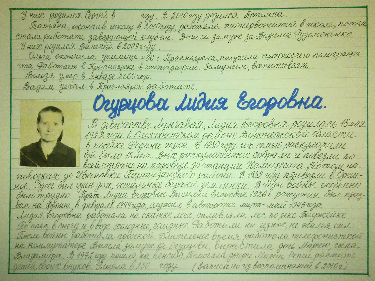 В девичестве Лангавая, Лидия Егоровна родилась 15 мая 1922 года в Ольховатском районе Воронежской области в поселке Родина героя. В 1930 году их семью раскулачили. Ей было 18 лет. Всех раскулаченных собрали и повезли по всей стране на паровозе до станции Камарачага. Потом на повозках до Ивановки Партизанского района. В 1932 году привезли в Орешное. Здесь был один дом, остальные бараки, землянки. В годы войны особенно было трудно. Брат Лидии Егоровны Василий Егорович 1926 г. рождения был призван на фронт в феврале 1944 года, служил в автороте март – май 1945 года. Лидия Егоровна работала на скатке леса, сплавляла лес по реке Баджейке. По пояс в снегу и в воде холодные, голодные. Работали на износ, не жалея сил. После войны работала прачкой. Длительное время работала телефонисткой на коммутаторе. Вышла замуж за Огурцова, вырастила дочь Марию, сына Владимира. В 1972 году пошла на пенсию. Помогала дочери Марии Репш растить детей, своих внуков. Умерла в 200___ году. (Записано из воспоминаний в 2010 г.)