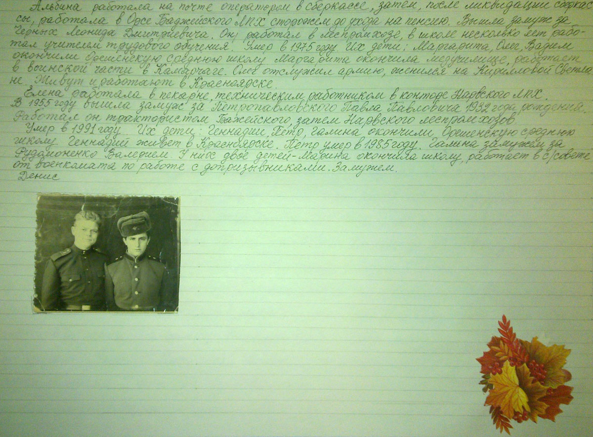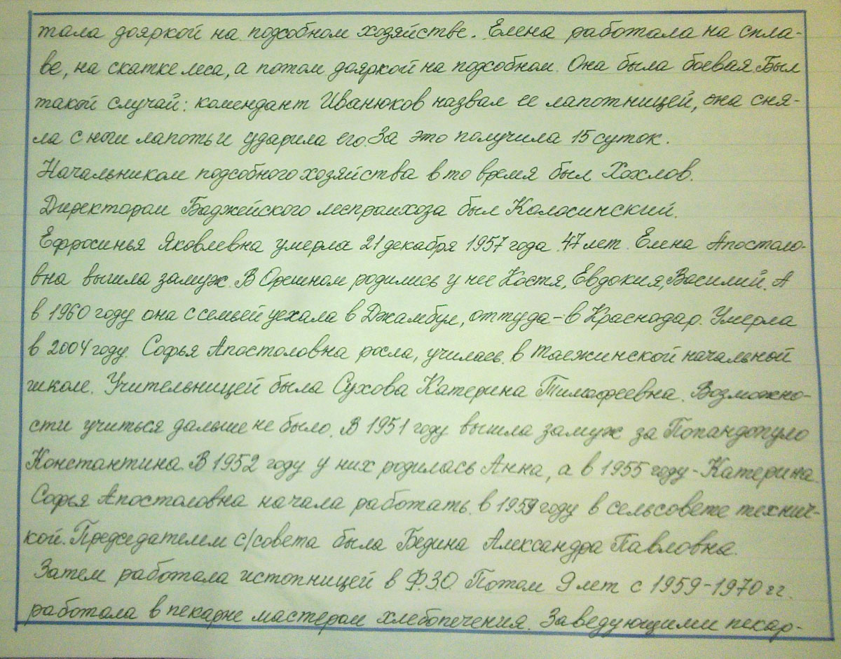 Елена работала на сплаве, на скатке леса, а потом дояркой на подсобном. Она была боевая. Был такой случай: комендант Иванюков назвал ее лапотницей, она сняла с ноги лапоть и ударила его. За это получила 15 суток. Начальником подсобного хозяйства в то время был Хохлов. Директором Баджейского леспромхоза был Колосинский. Ефросинья Яковлевна умерла 21 декабря 1957 года. 47 лет Елена Апостоловна вышла замуж. В Орешном родились у нее Костя, Евдокия, Василий. А в 1960 году она с семьей уехала в Джамбул, оттуда – в Краснодар. Умерла в 2004 году. Софья Апостоловна росла, училась в Таежинской начальной школе. Учительницей была Сухова Катерина Тимофеевна. Возможности учиться дальше не было. В 1951 году вышла замуж за Попандопуло Константина. В 1952 году у них родилась Анна, а в 1955 году – Катерина. Софья Апостоловна начала работать в 1959 году в сельсовете техничкой. Председателем с/совета была Бедина Александра Павловна. Затем работала истопницей в Ф.З.О. Потом 9 лет с 1959 -1970 г.г. работала в пекарне мастером хлебопечения. Заведующим пекарней были: Шорникова Александра Тихоновна, Груздева Мария Григорьевна.