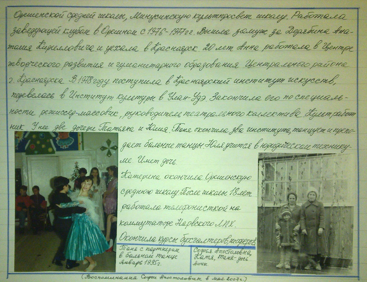 Софью Апостоловну, Божко Зинаиду Петровну перевели в центральную столовую ОРСа Баджейского ЛПХ поварами. Заведующими столовой были: Портнягина Тамара, Терентьева Антонина, Овечкина Галина, Кулешова Светлана, Донская Тамара, Меджене Ксения, Мужиус Феня, Ануфриева Галина. В 1988 году Софья Апостоловна ушла на заслуженный отдых. Где бы она ни работала, везде получала премии, грамоты за честный, добросовестный труд. Дети Софьи Апостоловны учились в школе. Анна окончила 9 классов Орешенской средней школы, Минусинскую культпросвет школу. Работала заведующей клубом в Орешном с 1976 – 1977 г.г. Вышла замуж за Дерябина Анатолия Кирилловича и уехала в Красноярск. 20 лет Анна работала в Центре творческого развития и гуманитарного образования Центрального района г. Красноярска. В 1978 году поступила в Красноярский институт искусств, перевелась в Институт Культуры в Улан-Удэ. Закончила его по специальности режиссер-массовик, руководитель театрального коллектива Культработник. У нее две дочери Татьяна и Юлия. Таня окончила два института, танцует и преподает бальные танцы. Юля учится в юридическом техникуме. Имеет дочь. Катерина окончила Орешенскую среднюю школу. После школы 18 лет работала телефонисткой на коммутаторе Нарвского ЛПХ. Окончила курсы бухгалтеров, шоферов.