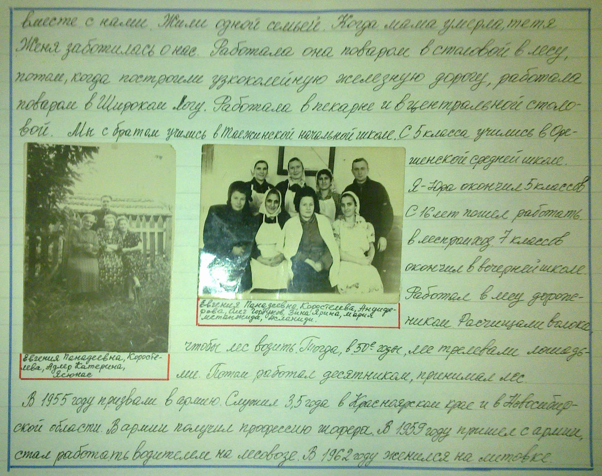 Жили одной семьей. Когда мама умерла, тетя Женя заботилась о нас. Работала она поваромв столовой в лесу, потом, когда построили узкоколейную железную дорогу, работала поваром в Широком Логу. Работала в пекарне и в центральной столовой. Мы с братом учились в Таежинской школе. С 5 класса учились в Орешенской средней школе. Я – Юра окончил 5 классов. С 16 лет пошел работать в леспромхоз, 7 классов окончил в вечерней школе.