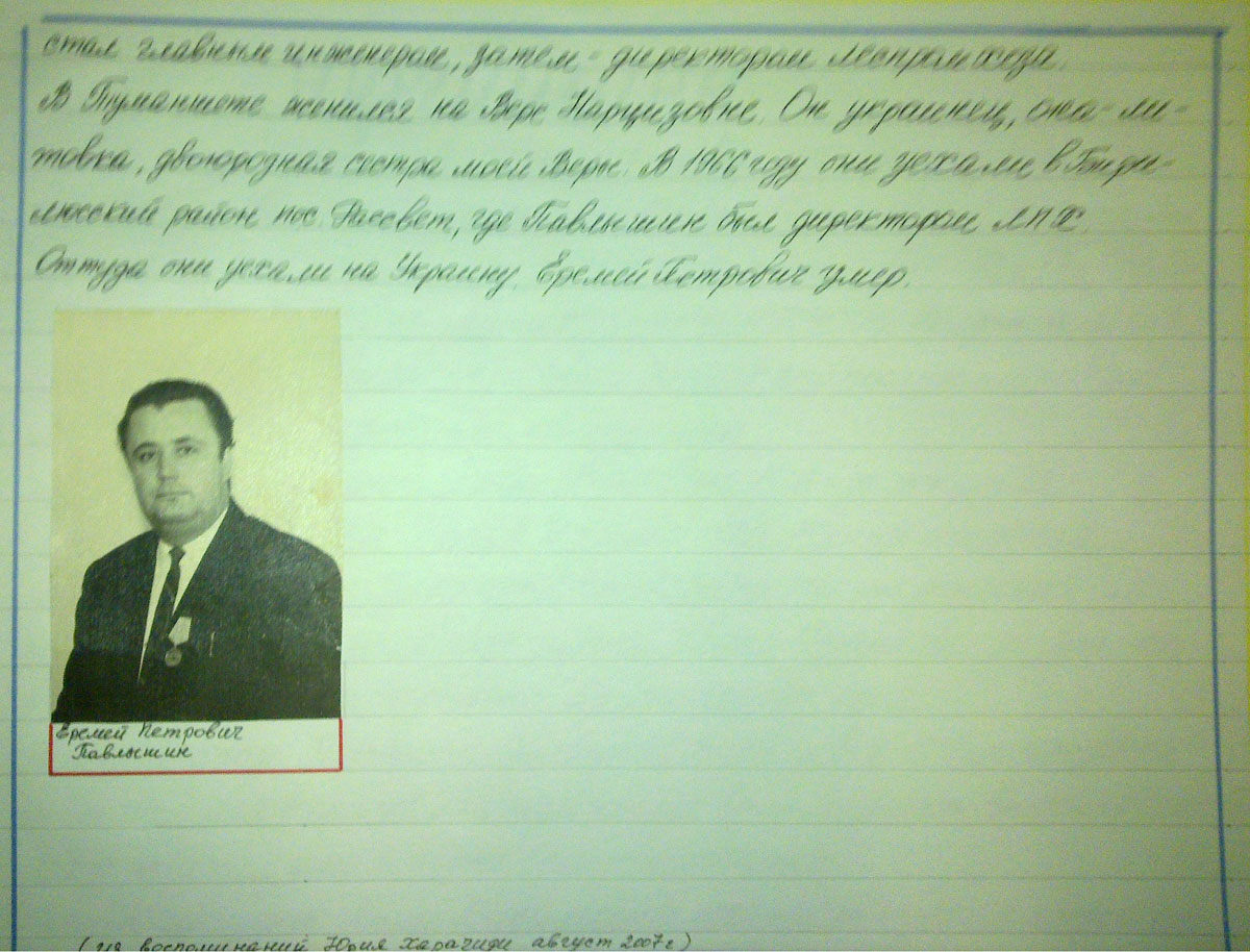 В Туманшете женился на Вере Нарцизовне. Он украиней, она литовка, двоюродная сестра моей Веры. В 1966 году они уехали в Бирилюсский район пос. Рассвет, где Павлышин был директором ЛПХ. Оттуда они уехали на Украину. Еремей Петрович умер.