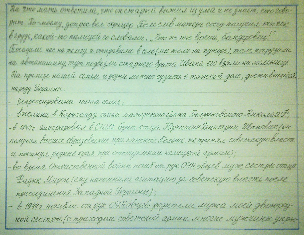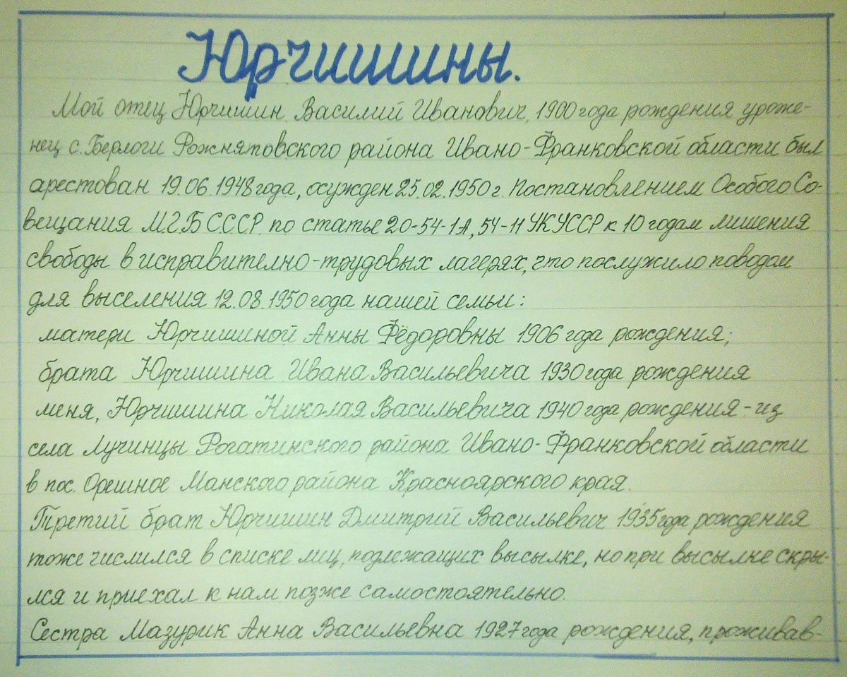 Мой отец Юрчишин Василий Иванович, 1900 года рождения уроженец с. Берлоги Рожнятовского района Ивано-Франковской области был арестован 19.06.1948 года, осужден 25.02.1950 г. Постановлением Особого Совещания М.Г.Б. СССР по статье 20-54-1А УК УССР к 10 годам лишения свободы в исправительно-трудовых лагерях, что послужило поводом для выселения 12.08.1950 года нашей семьи: матери Юрчишиной Анны Федоровны 1906 года рождения, брата Юрчишина Ивана Васильевича 1930 года рождения, меня Юрчишина Николая Васильевича 1940 года рождения – из села Лучинцы Рогатинского района Ивано-Франковской области в пос. Орешное Манского района Красноярского края.