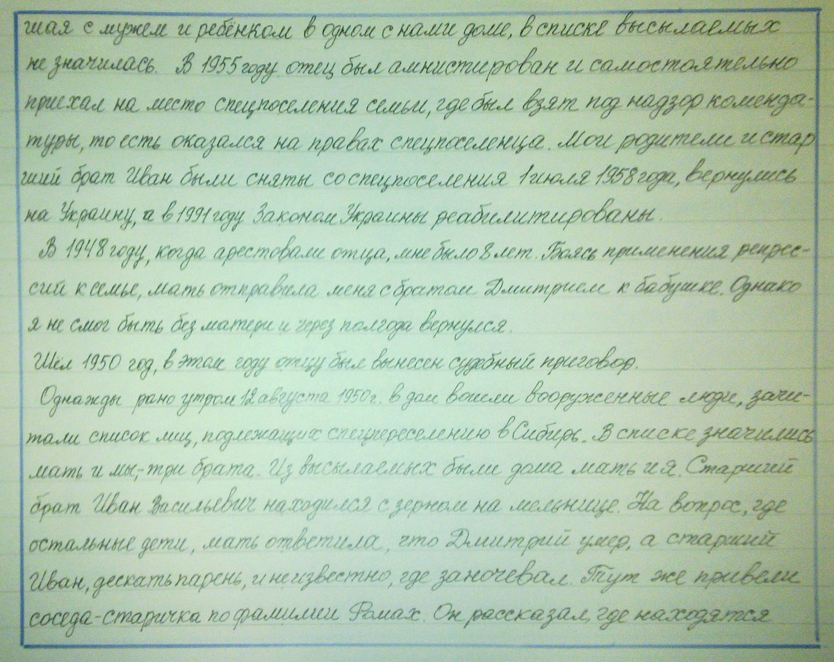В 1948 году, когда арестовали моего отца, мне было 8 лет. Боясь применения репрессий к семье, мать отправила меня с братом Дмитрием к бабушке. Однако я не смог быть без матери и через полгода вернулся. Шел 1950 год, в этом году отцу был вынесен судебный приговор. Однажды рано утром 12 августа 1950 г. в дом вошли вооруженные люди, зачитали список лиц, подлежащих спецпереселению в Сибирь. В списке значились мать и мы, - три брата. Из выселяемых были дома мать и я. Старший брат Иван Васильевич находился с зерном на мельнице. На вопрос, где остальные дети, мать ответила, что Дмитрий умер, а старший Иван, дескать парень, и неизвестно, где заночевал. Тут же привели соседа – старичка по фамилии Ромах. Он рассказал, где находятся.