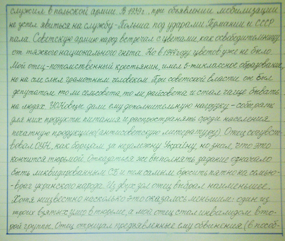 В 1939 г., при объявлении мобилизации не успел явиться на службу – Польша под ударами Германии и СССР пала. Советскую армию народ встречал с цветами, как освободительницу от тяжкого национального гнета. Но в 1944 году цветов уже не было. Мой отец – потомственный крестьянин, имел 5-тиклассное образование, но на селе слыл грамотным человеком. При советской власти он был депутатом то ли сельсовета, то ли райсовета и стал чаще бывать на людях. ОУНовцы дали ему дополнительную нагрузку – собирать для них продукты питания и распространять среди населения печатную продукцию (антисоветскую литературу). Отец сочувствовал ОУН, как борцам за незалежну Украiну, но знал, что это кончится тюрьмой. Отказаться же выполнять задание означало быть ликвидированным СБ и тем самым бросить пятно на семью – враг украинского народа. Из двух зол отец выбрал наименьшее. Хотя неизвестно насколько это оказалось меньшим: один из троих взятых умер в тюрьме, а мой отец стал инвалидом второй группы. Отец отрицал предъявленные ему обвинения (в пособничестве ОУНовцам), чтобы не потянуть за собой цепочку следующих жертв.