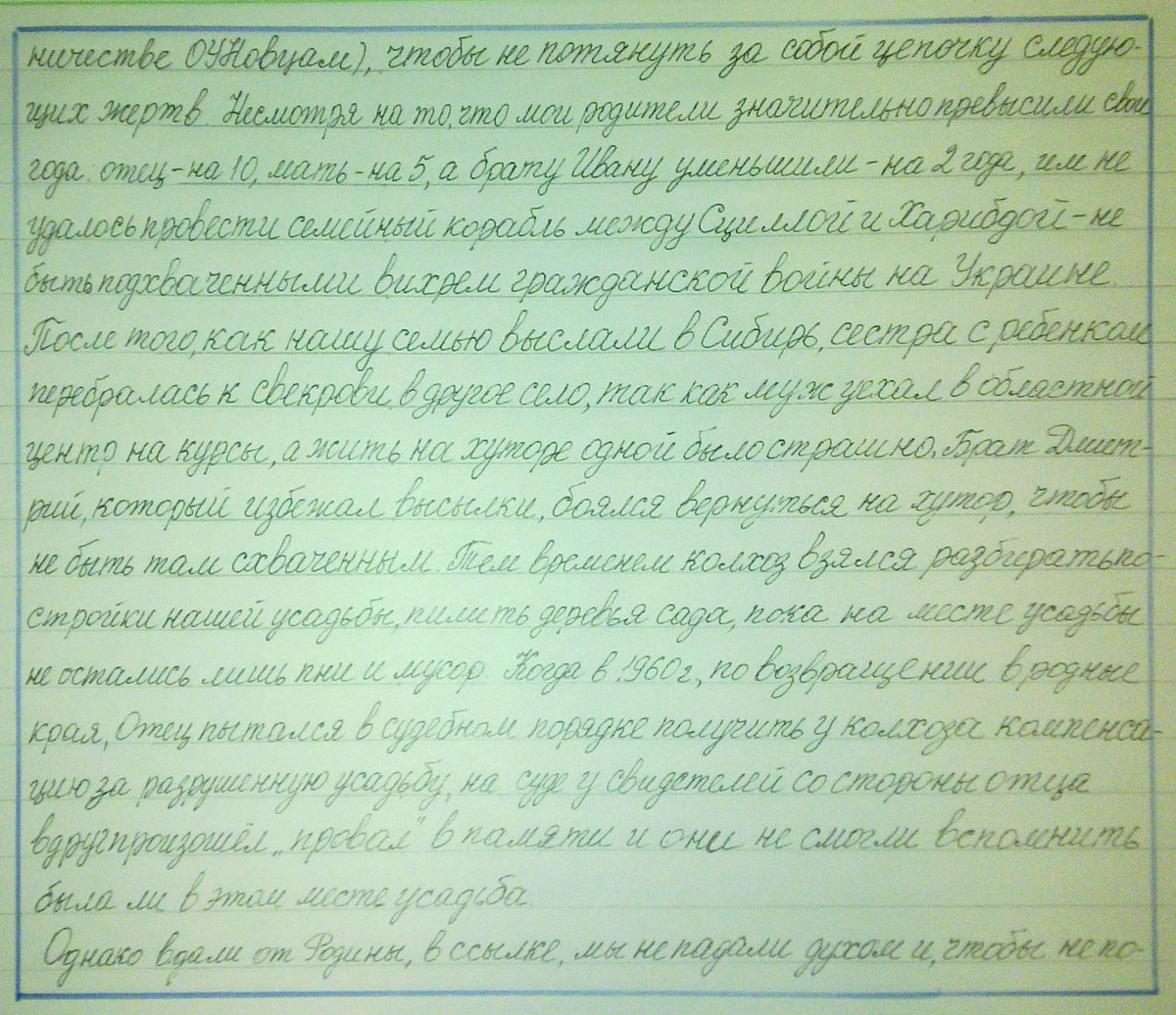 Несмотря на то, что мои родители значительно превысили свои года: отец на 10 лет, а мать – на 5 лет, а брату Ивану уменьшили – на 2 года, им не удалось провести семейный корабль между Сциллой и Харибдой – не быть подхваченными вихрем гражданской войны на Украине. После того, как нашу семью выслали в Сибирь, сестра с ребенком перебралась к свекрови в другое село, так как муж уехал в областной центр на курсы, а жить на хуторе одной было страшно. Брат Дмитрий, который избежал высылки, боялся вернуться на хутор, чтобы не быть там схваченным. Тем временем колхоз взялся разбирать постройки нашей усадьбы, пилить деревья сада, пока на месте усадьбы не остались лишь пни и мусор. Когда в 1960 г., по возвращении в родные края, Отец пытался в судебном порядке получить у колхоза компенсацию за разрушенную усадьбу, на суде у свидетелей со стороны отца вдруг произошел «провал» в памяти и они не смогли вспомнить была ли в этом месте усадьба.