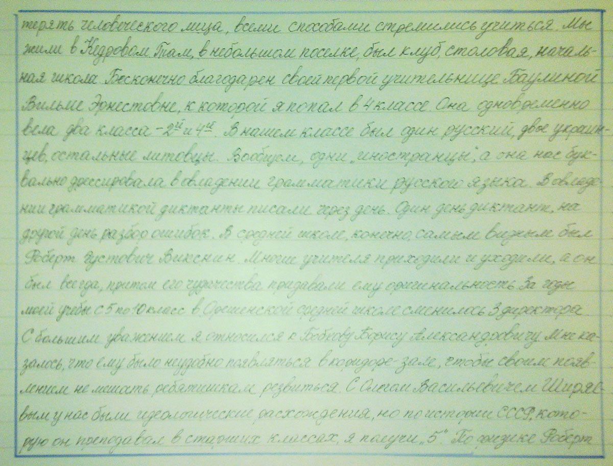 Мы жили в Кедровом. Там, в небольшом поселке, был клуб, столовая, начальная школа. Бесконечно благодарен своей первой учительнице Баулиной Вильме Эрнестовне, к которой я попал в 4 классе. Она одновременно вела два класса – 2й и 4й. В нашем классе был один русский, двое украинцев, остальные литовцы. Вообщем, одни «иностранцы», а она нас буквально дрессировала в овладении грамматики русского языка. В овладении грамматикой диктанты писали через день. Один день диктант, на другой день разбор ошибок. В средней школе конечно самым видным был Роберт Густавович Викенин. Многие учителя приходили и уходили, а он был всегда, притом его чудачества придавали ему оригинальность. За годы моей учебы с 5 по 10 класс в Орешенской средней школе сменилось 3 директора. С большим уважением я относился к Бобкову Борису Александровичу. Мне казалось, что ему было неудобно появляться в коридоре-зале, чтобы своим появлением не мешать ребятишкам резвиться. С Олегом Васильевичем Ширяевым у нас были идеологические расхождения, но по истории СССР, которую он преподавал в старших классах, я получил «5». По физике Роберт Густавович тоже поставил отлично и я ее подтвердил при поступлении в Томский политехнический институт.