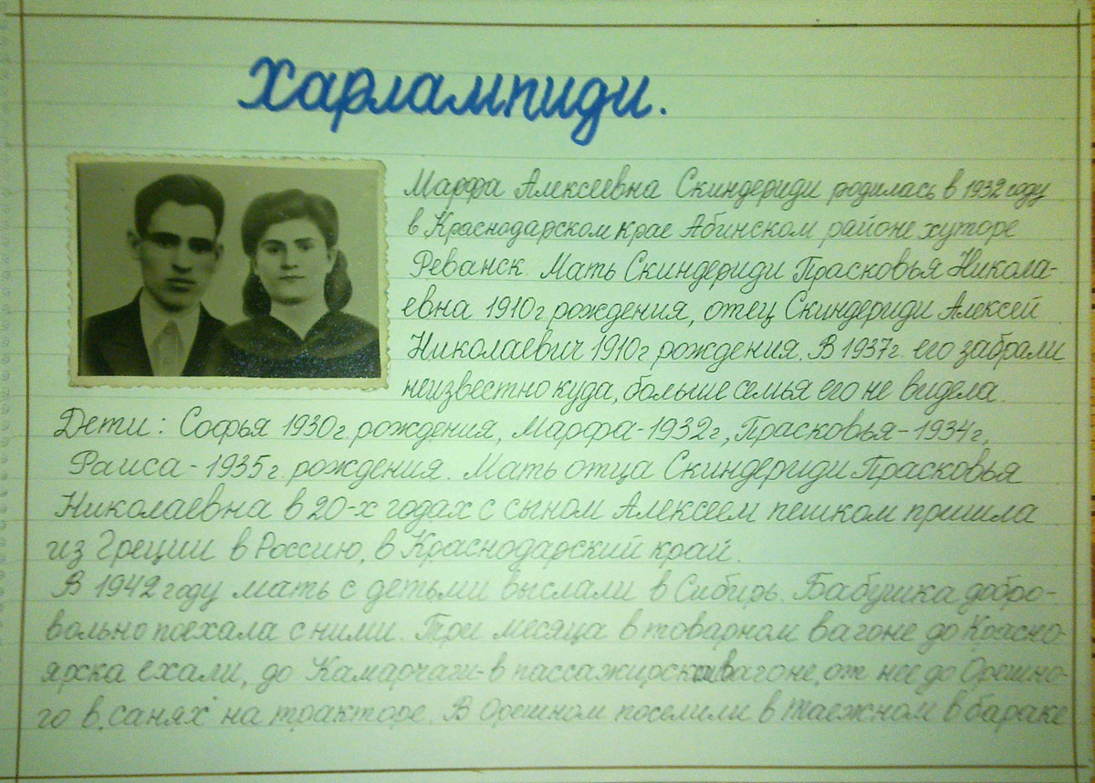 Марфа Алексеевна Скиндериди родилась в 1932 годуц в Краснодарском крае Абинском районе хуторе Реванск. Мать Скандериди Прасковья Николаевна 1910 г. рождения, отец Скандериди Алексей Николаевич 1910 г. рождения. В 1937 г. его забрали неизвестно куда, больше семья его не видела. Дети: Софья 1930 г. рождения, Марфа -1932 г., Прасковья – 1934 г., Раиса – 1935 г. рождения. Мать отца Скиндериди Прасковья Николаевна в 20-х годах с сыном Алексеем пешком пришла из Греции в Россию, в Краснодарский край. В 1942 году мать с детьми выслали в Сибирь. Бабушка добровольно поехала с ними. Три месяца в товарном вагоне до Красноярска ехали, до Камарчаги – в пассажирском вагоне, от нее до Орешного в санях на тракторе. В Орешном поселили в Таежном в бараке по 10 семей в одной комнате: печка посредине 5 семей по одну сторону печки, 5 – по другую.