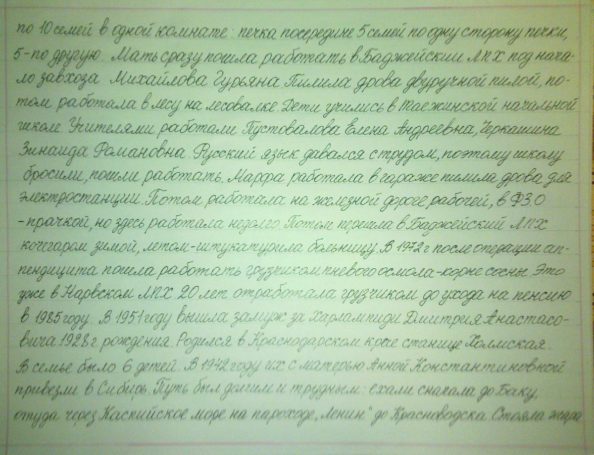 Мать сразу пошла работать в Баджийский ЛПХ под начало завхоза Михайлова Гурьяна. Пилила дрова двуручной пилой, потом работала в лесу на лесовалке. Дети учились в Таежинской начальной школе. Учителями работали Пустовалова Елена Андреевна, Черкашина Зинаида Романовна. Русский язык давался с трудом, поэтому школу бросили, пошли работать. Марфа работала в гараже пилила дрова для электростанции. Потом работала на железной дороге рабочей, в ФЗО – прачкой, но здесь работала недолго. Потом перешла в Баджийский ЛПХ кочегаром зимой, летом – штукатурила больницу. В 1972 после операции аппендицита пошла работать грузчиком пневого осмола–корне сосны. Это уже в Нарвском ЛПХ. 20 лет отработала грузчиком до ухода на пенсию в 1985 году. В 1951 году вышла замуж за Харлампиди Дмитрия Анастасовича 1928 года рождения. Родился в Краснодарском крае станице Холмская. В семье было 6 детей. В 1942 году их с матерью Анной Константиновной привезли в Сибирь. Путь был долгим и трудным: ехали сначала до Баку, оттуда через Каспийское море на пароходе «Ленин» до Красноводска. Стояла жара 400С, воды не было, привозили и продавали лед, кусок льда 50 коп. за килограмм.