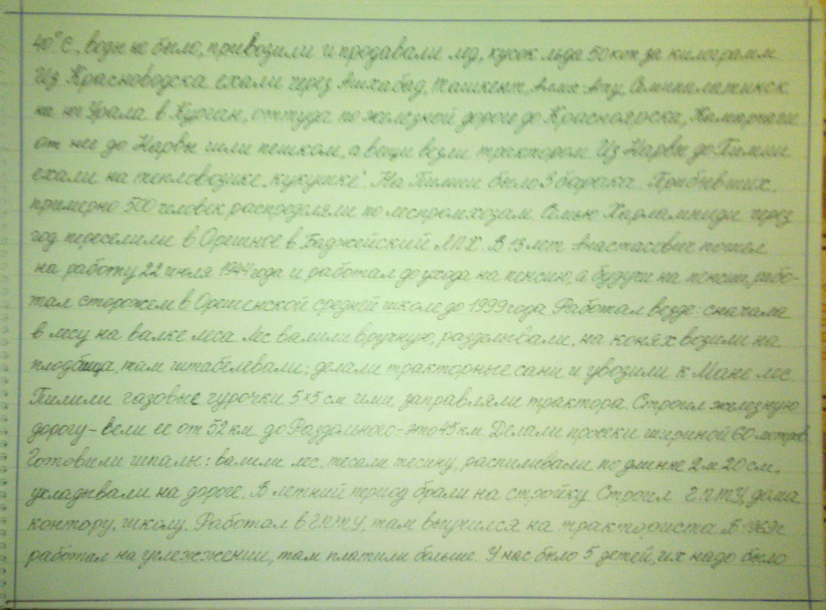 Из Красноводска ехали через Ашхабад, Ташкент, Алма-Ату, Семипалатинск на юг Урала, в Курган, оттуда по железной дороге до Красноярска, Камароги, от нее до Нарвы шли пешком, а вещи везли трактором. Из Нарвы в П… ехали на тепловозике «кукушка». На П… было 3 барака. Прибывших примерно 500 человек распределяли по леспромхозам. Семью Харлампиди через год переселили в Орешное, в Баджейский ЛПХ. В 13 лет Анастасович пошел на работу 22 ибля 1944 года и работал до ухода на пенсию, а будучи на пенсии, работал сторожем в Орешенской средней школе до 1999 года. Работал везде: сначала в лесу на валке леса. Лес валили вручную, разделывали, на конях возили на плодбища (плотбища), там штабелевали: делали тракторные сани и увозили к Мане лес. Пилили газовые чурочки 5 х 5 см ими заправляли трактора. Строил железную дорогу – вели ее от 52 км до Раздольного – это 45 км. Делали просеки шириной 60 метров. Готовили шпалы: валили лес, тесали тесину, распиливали по длине 2 м 20 см, укладывали на дороге. В летний период брали на стройку. Строил ГПТУ, дома, контору, школу. Работал в ГПТУ, там выучился\ на тракториста. В 1969 г. работал на углежжении, там платили больше. У нас было 5 детей, их надо было растить.
