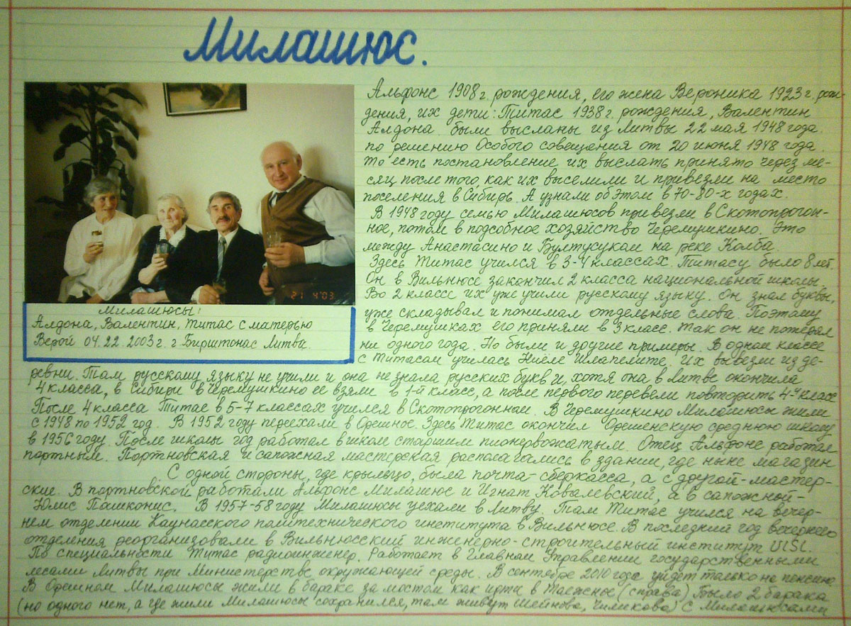 Альфонс 1908 г. рождения, его жена Вероника 1923 г. рождения, их дети: Титас 1938 г. рождения, Валентин, Алдона были высланы из Литвы 22 мая 1948 года по решению Особого совещания от 20 июня 1948 года, т.е. постановление их выслать принято через месяц после того, как их выселили и привезли на место поселения в Сибирь. А узнали об этом в 70-80 годах. В 1948 году семью Милашюсов привезли в Скотопрогонное, потом в подсобное хозяйство Черемушкино. Это между Анастасино и Бултусуком на реке Колба. Здесь Титас учился в 3 – 4 классах. Титасу было 8 лет. Он в Вильнюсе закончил 2 класса национальной школы. Во 2 классе их уже учили русскому языку. Он знал буквы, уже складывал и понимал отдельные слова. Поэтому в Черемушках его приняли в 3 класс. Так он не потерял ни одного года. Но были и другие примеры. В одном классе с Титасом училась Ниёле Шлапелите. Их вывезли из деревни. Та русскому языку не учили и она не знала русских букв и, хотя она в Литве окончила 4 класса, в Сибири в Черемушкино ее взяли в 1-й класс, а после первого перевели повторить 4-й класс. После 4 класса Титас в 5 – 7 классах учился в Скотопрогонном. В Черемушкино Милашюсы жили с 1948 по 1952 год. В 1952 году переехали в Орешное. Здесь Титас окончил Орешенскую среднюю школу в 1956 году. После школы год работал в школе старшим пионервожатым. Отец Альфонс работал портным. Портновская и сапожная мастерская располагалась в здании, где ниже магазин. С одной стороны, где крыльцо была почта-сберкасса, а с другой – мастерские. В портновской работали Альфонс Милашюс и Игнат Ковалевский, а в сапожной – Юлис Пашконис. В 1957-58 году Милашюсы уехали в Литву. Там Титас учился на вечернем отделении Каунасского политехнического института в Вильнюсе. В последний год вечернего отделения реорганизовали в Вильнюсский инженерно-строительный институт ULSL. По специальности Титас радиоинженер. Работает в Главном Управлении государственными лесами Литвы при Министерстве окружающей среды. В сентябре 2010 года уйдет только на пенсию. В Орешном Милашюсы жили в бараке за мостом как идти в Таежное (справа). Было 2 барака (но одного нет, а где жили Милашюсы сохранился, там живут Шейнова, Чиликова). С Милашюсами в бараке жили семьи: Чепиль, Чачунь, Довиденас и другие.