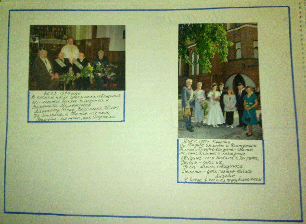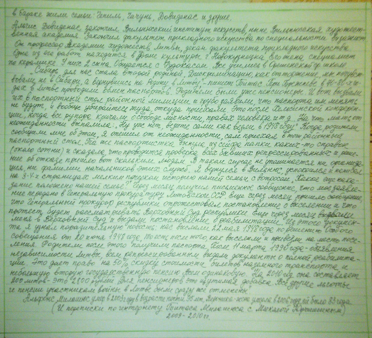 В 1960 году были освобождены от комендатуры, можно было вернуться в Литву. Старшая сестра Броня вернулась в Литву. Ей вернули дом, помогли материально. Там она живет. Алдона вышла замуж за Титова, уехала в Баджей, их дети Надя и __________ окончили Орешенскую среднюю школу. Алдона умерла. Младшие Она и Альбина окончили Орешенскую среднюю школу. Она работала библиотекарем в библиотеке Баджейского ЛПХ. Вышла замуж за Худикова Анатолия Прокопьевича 1938 г. рождения. Инженер. Их дети Саша, Наташа учились в школе, но заканчивали уже…