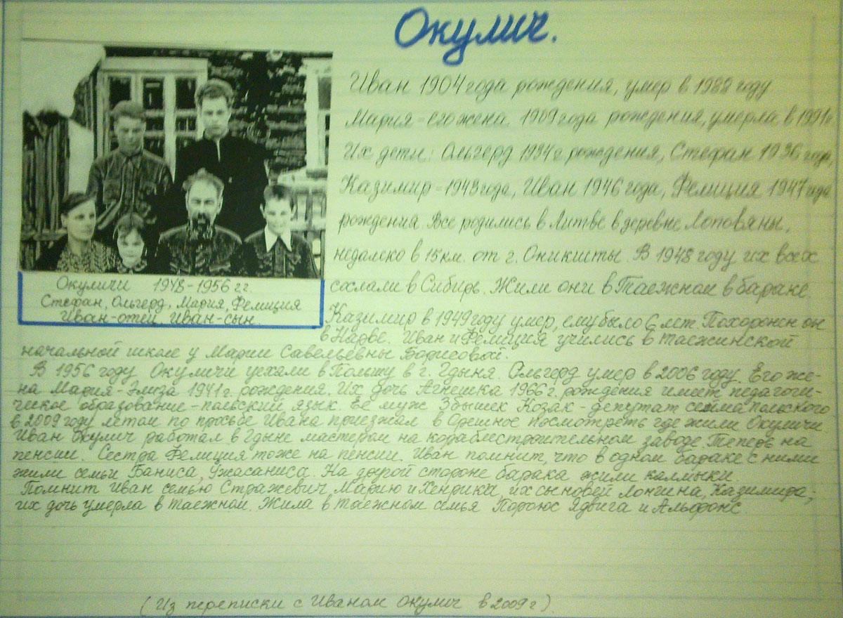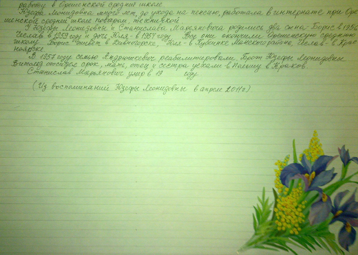 В 1948 году родителей раскулачили, а всю семью сослали в Сибирь. Две недели ехали до ст. Камарчага в душных, тесных товарных вагонах. От Камарчаги на грузовых машинах привезли в Орешное. Пергунов лог, барак. Стали обживаться: раскопали землю, посадили картошку, овощи. Вскоре купили корову. Отец пошел работать на узкоколейку, но через год, в 1949 году умер в возрасте 60 лет. Мать была домохозяйка. Умерла в 1973 году, ей было 71 год. Старший брат Альфонс и сестра Алдона работали в лесу в леспромхозе. Альфонс был вальщиком, ему было 24 года. Антон работал в ОРСе грузчиком, потом работал в леспромхозе на заготовке леса. Женат был на Фаине Павловне Петропавловской. Она работала перед уходом на пенсию (в 70-х годах) заведующей столовой. Их дети: Иван, Алексей окончили Орешенскую среднюю школу, отслужили в армии, женились. Работали в Нарвском ЛПХ рабочими. Иван женился, живет в г. Красноярске. Алексей был женат на Нине Рыскиной. Она рано умерла. Их дети: Алексей и Наташа учились в школе, окончили 9 классов. Живут в Красноярске. Отец женился на Душотиной Марии. Живут в Баджее.