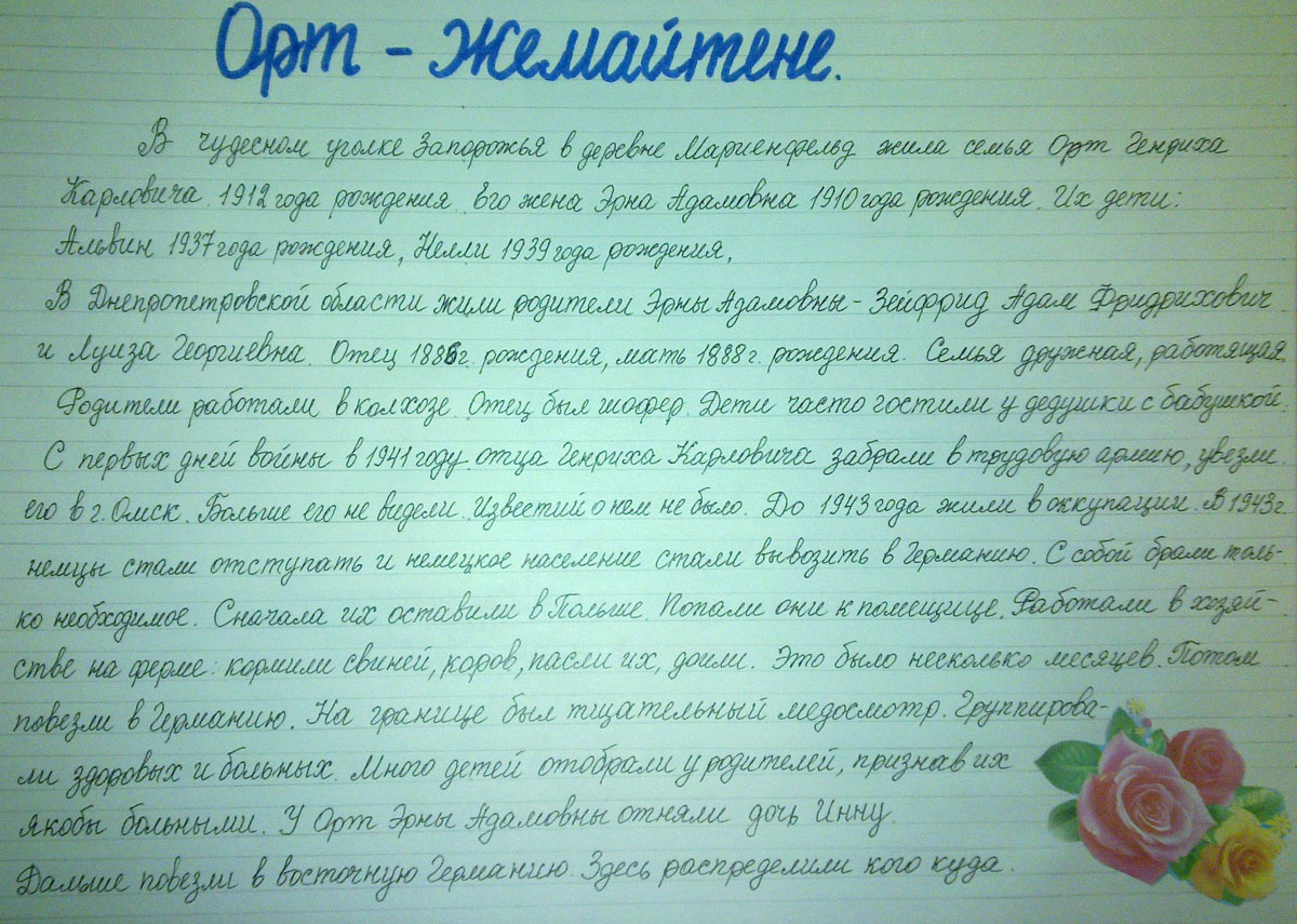 В Днепропетровской области жили родители Эрны Адамовны – Зейфрид Адам Фридрихович и луиза Георгиевна. Отец 1886 г. рождения, мать 1888 г. рождения. Семья дружная, работящая. Родители работали в колхозе. Отец был шофер. Дети часто гостили у дедушки с бабушкой. С первых дней войны в 1941 году отца Генриха Карловича забрали в трудовую армию, увезли его в г. Омск. Больше его не видели. Известий о нем не было. До 1943 года жили в оккупации. В 1943 немцы стали отступать и немецкое население стали вывозить в Германию. С собой брали только необходимое. Сначала их оставили в Польше. Попали они к помещице. Работали в хозяйстве на ферме: кормили свиней, коров, пасли их, доили. Это было несколько месяцев. Потом повезли в Германию. На границе был тщательный медосмотр. Группировали здоровых и больных. Много детей отобрали у родителей, признав их якобы больными. У Орт Эрны Адамовны отняли дочь Инну. Дальше повезли в восточную Германию. Здесь распределили кого куда.