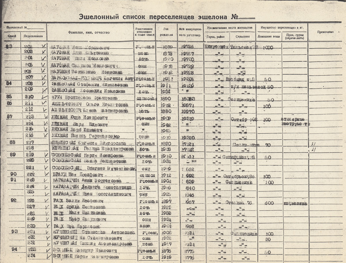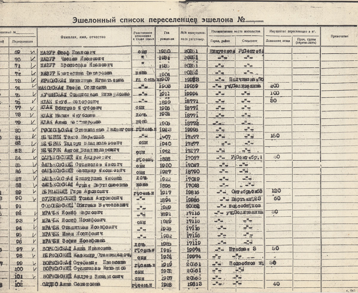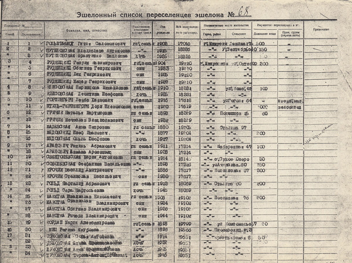 АВДЕВИЧ Бронислава Михайловна. Род. в 1909. Полька. Состав семьи: дети Яда Петровна 1925 г.р., Винта 1933 г.р., Рахиль 1926 г.р., Дина 1920 г.р. Находились в ссылке в Минусинске, репатриированы в Польшу в 1946 г.