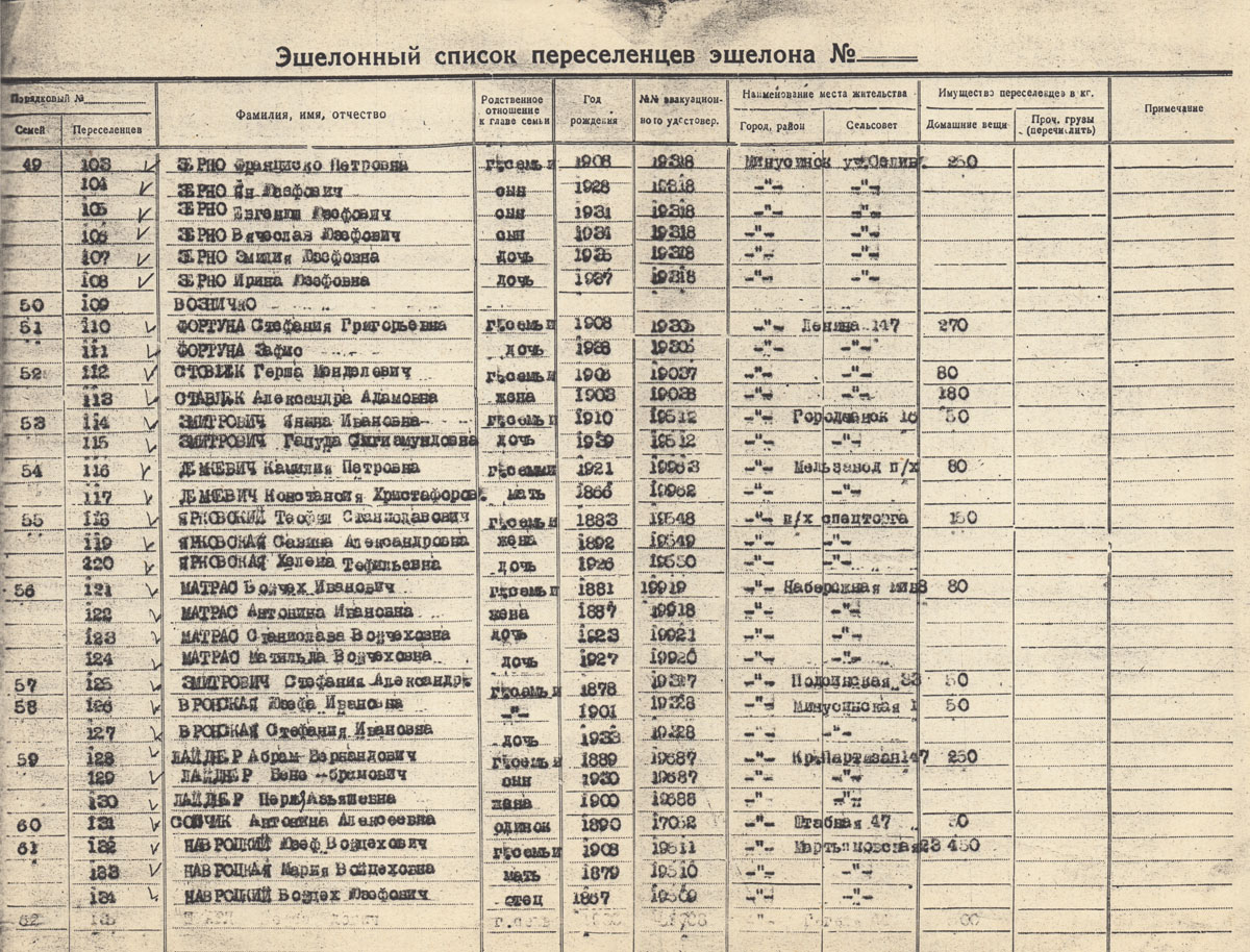 ЗМИТРОВИЧ Янина Ивановна. Род. 1910. Полька. Дочь Галуда Сигизмундовна 1939 г.р. Находились в ссылке в Минусинске, репатриированы в Польшу в 1946 г.