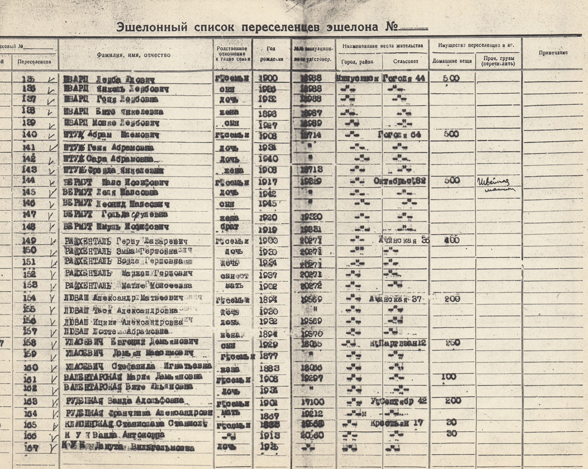 ЛЮВАШ Александр Матвеевич. Род. в 1894. Поляк. Состав семьи: жена Лотте Абрамовна 1894 г.р., дети Тася 1930 г.р., Ицкия 1932 г.р. Находились в ссылке в Минусинске, репатриированы в Польшу в 1946 г.