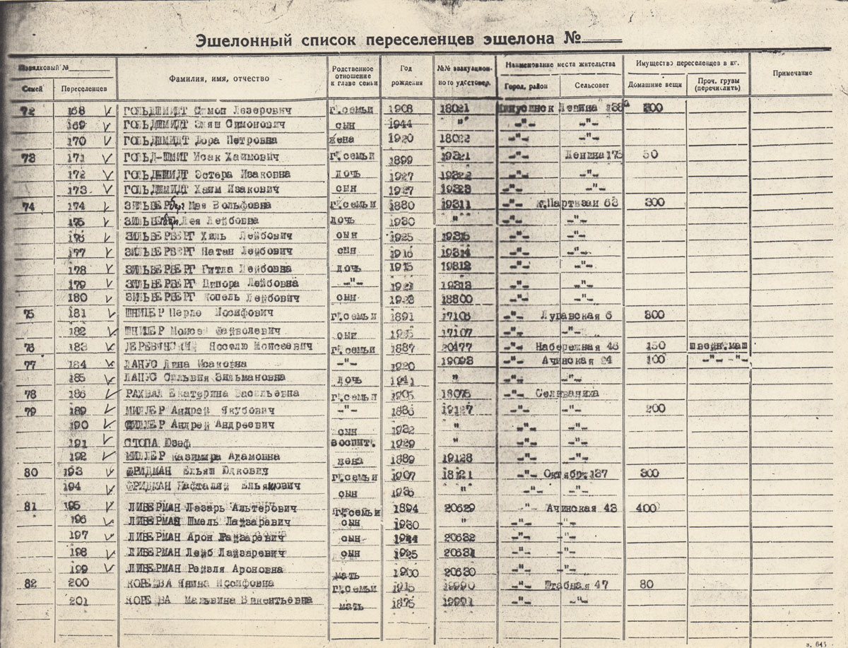 ЛИБЕРМАН Лазарь Альтерович. Род. в. 1894. Поляк. Состав семьи: дети Шмель Лайзерович 1930 г.р. , Арон 1944 г.р., Лейб 1945 г.р., мать Рейзля Ароновна 1860 г.р. Находились в ссылке в Минусинске, репатриированы в Польшу в 1946 г.