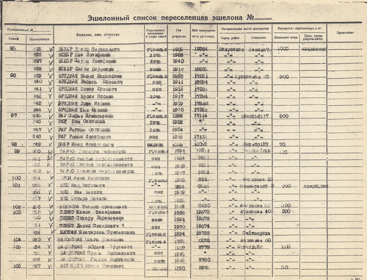 ФРИДМАН Израиль Лазаревич. Род. в 1886. Поляк. Состав семьи: дети Дебора 1929 г.р., Насиру 1926 г.р., Изан 1913 г.р., Фенкес 1916 г.р., мать Файге Михайловна 1889 г.р. Находились в ссылке в Минусинске, репатриированы в Польшу в 1946 г.