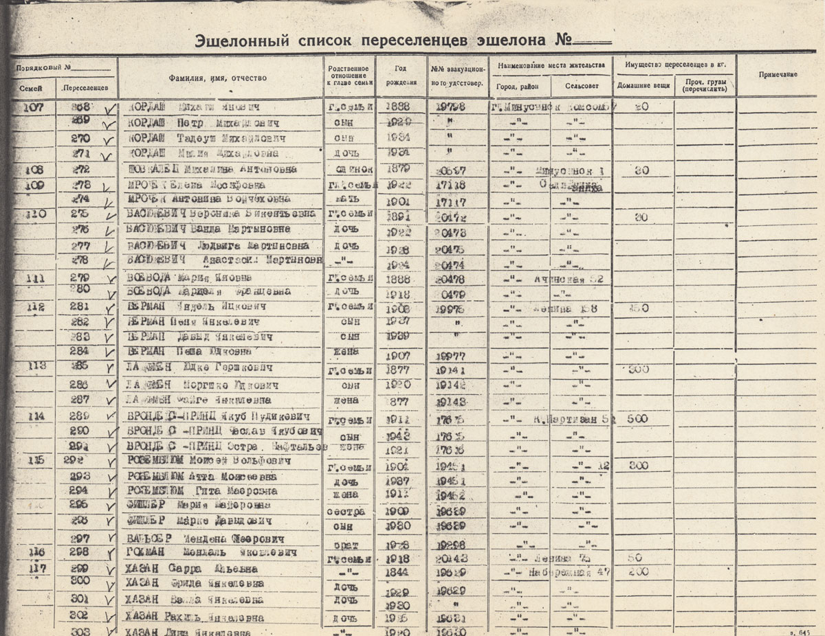 ЗИЛЬБЕРБЕРГ Мая Вольфовна. Род. в 1880. Полька. Состав семьи: дети Лея Лейбовна 1930 г.р., сын Гитла 1915 г.р., Ципора 1921 г.р., Хиль 1925 г.р., , Натан 1916 г.р., Копель 1923 г.р. Находились в ссылке в Минусинске, репатриированы в Польшу в 1946 г.