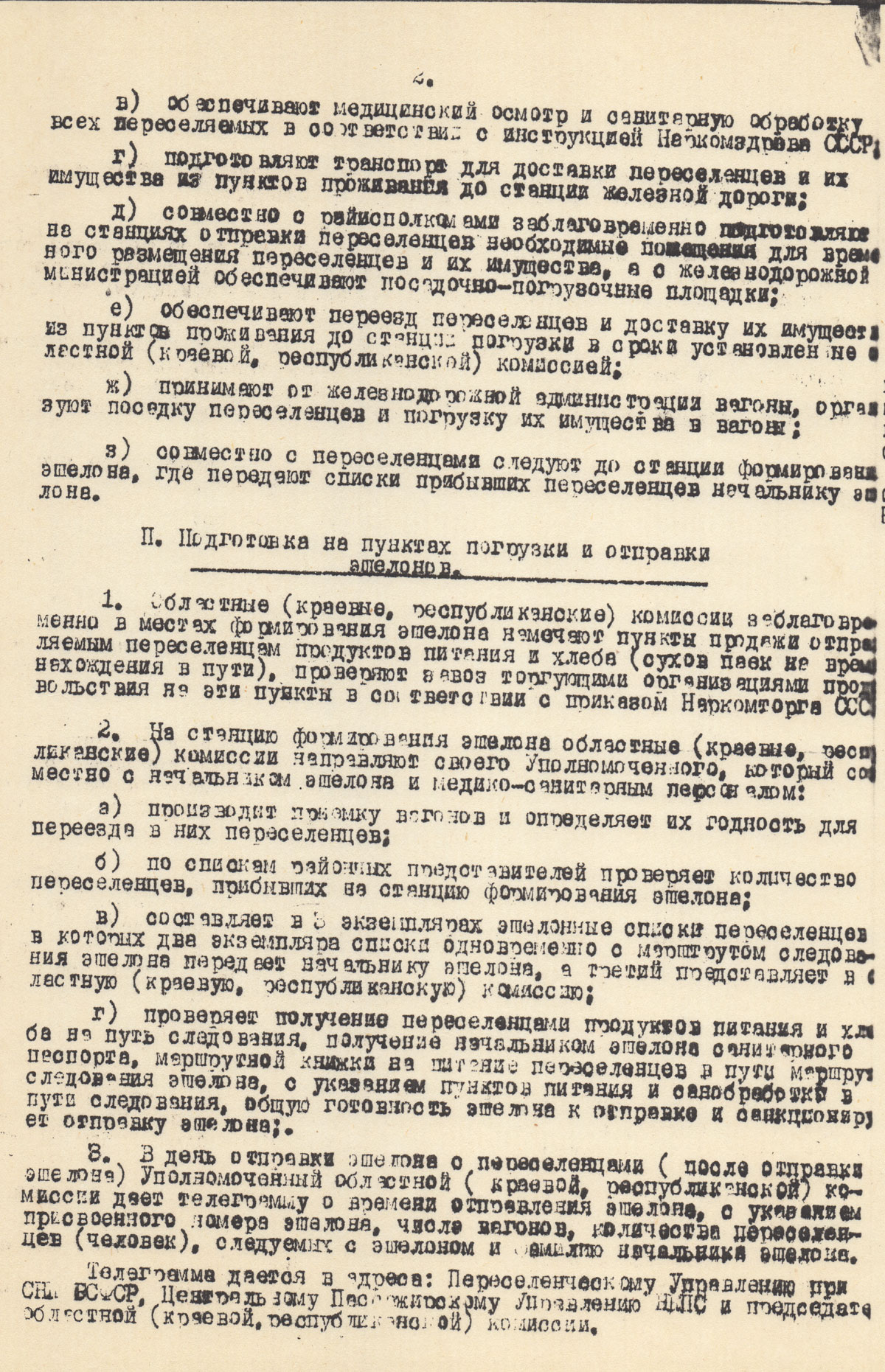 1. Областные (краевые, республиканские) комиссии заблаговременно в местах формирования эшелона намечают пункты продажи отправляемым переселенцам продуктов питания и хлеба (сухой паек на время нахождения в пути), проверяют завоз торгующими организациями продовольствия на эти пункты в соответствии с приказом Наркомторга СССР;