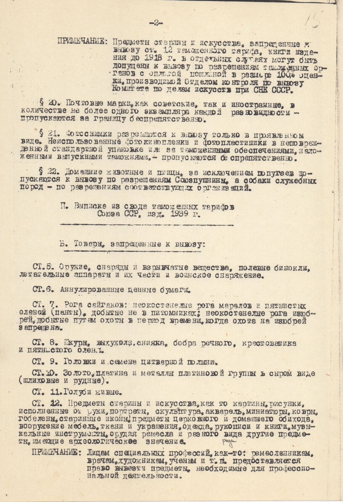ПРИМЕЧАНИЕ: Предметы старины и искусства, запрещенные к вывозу ст.12 таможенного тарифа, книги издания до 1918 г. в отдельных случаях могут быть допущены к вывозу по разрешениям таможенных органов с оплатой пошлины в размере 100% оценки, производимой Отделом контроля по вывозу Комитета по делам искусств при СНК СССР.