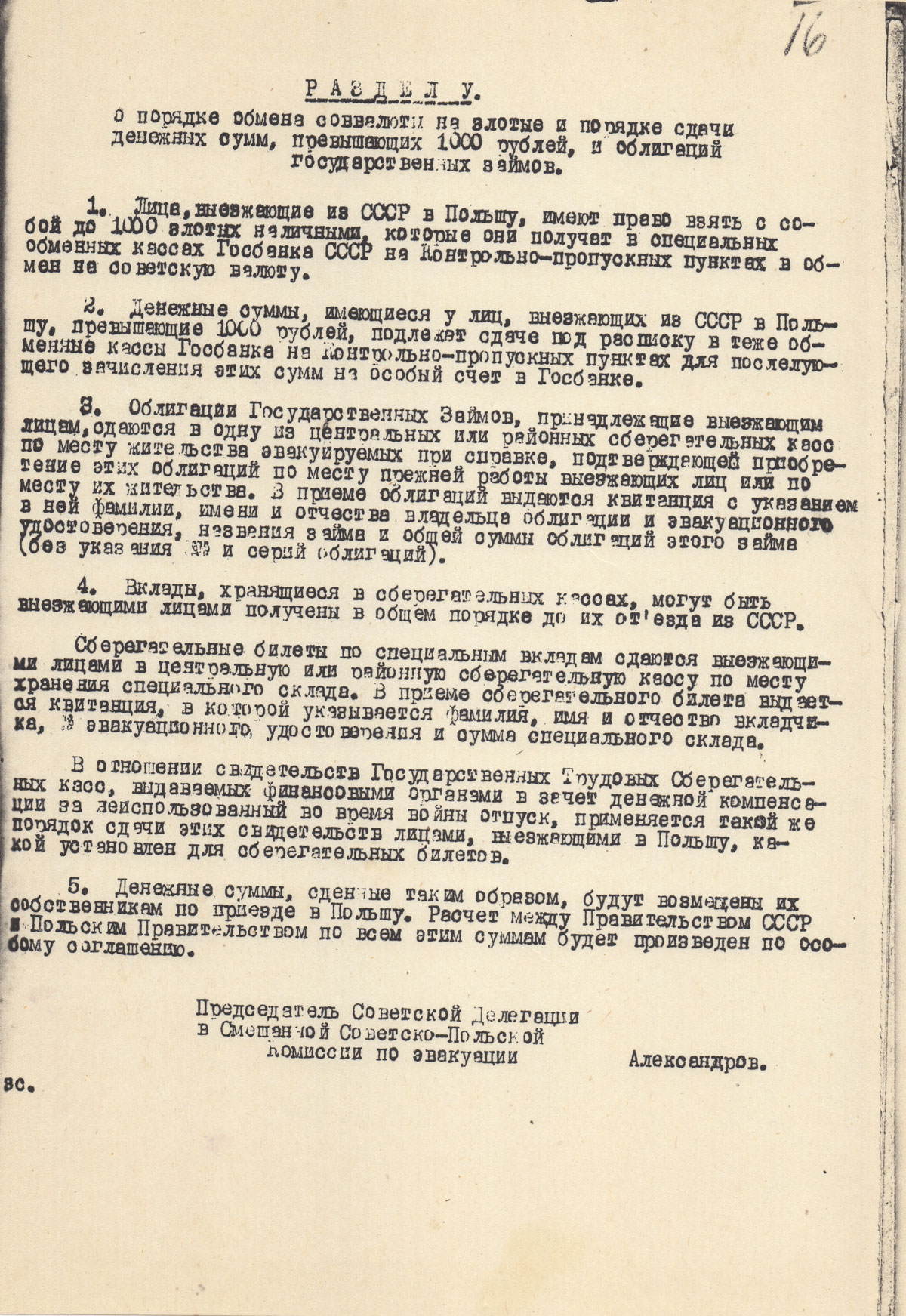 5. Денежные суммы, сданные таким образом, будут возмещены их собственникам по приезду в Польшу. Расчет между Правительством СССР и Польским Правительством по всем этим суммам будет произведен по особому соглашению.