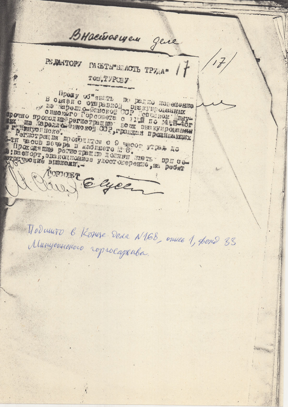 РЕДАКТОРУ ГАЗЕТЫ «ВЛАСТЬ ТРУДА»