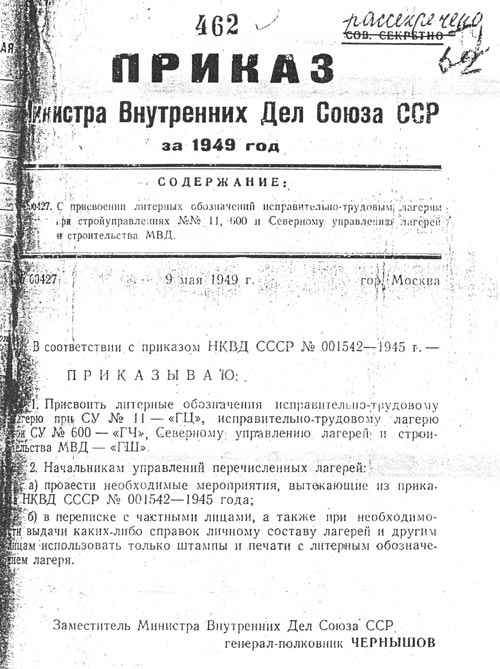 1. Присвоить литерные обозначения исправительно-трудовому лагерю при СУ № 11 — «ГЦ», исправительно-трудовому лагерю при СУ № 600 — «ГЧ», Северному управлению лагерей и строительства МВД — «ГШ»