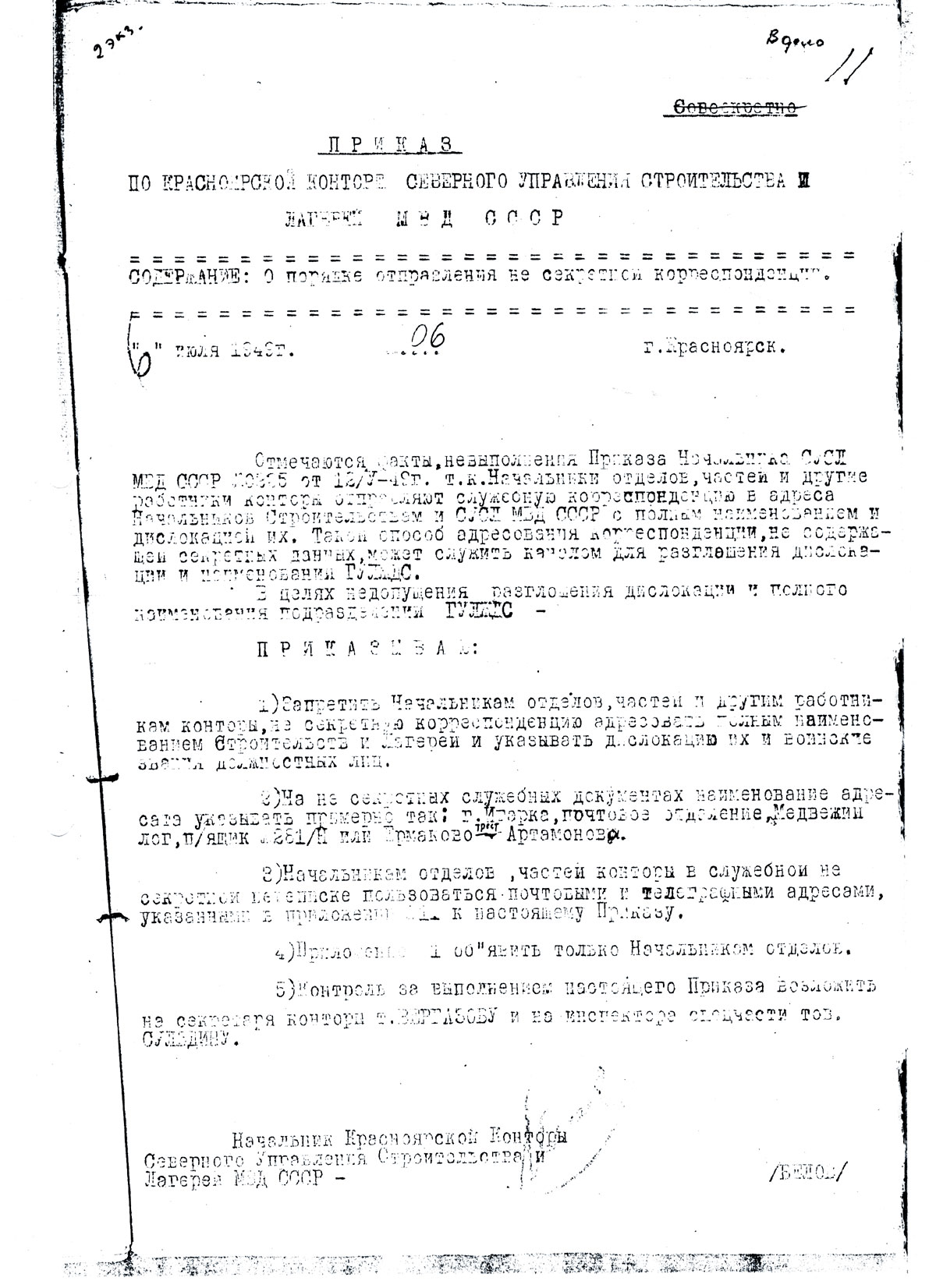Приказ по Красноярской конторе Северного управления строительства и лагерей МВД СССР "О порядке отправления не секретной корреспонденции"