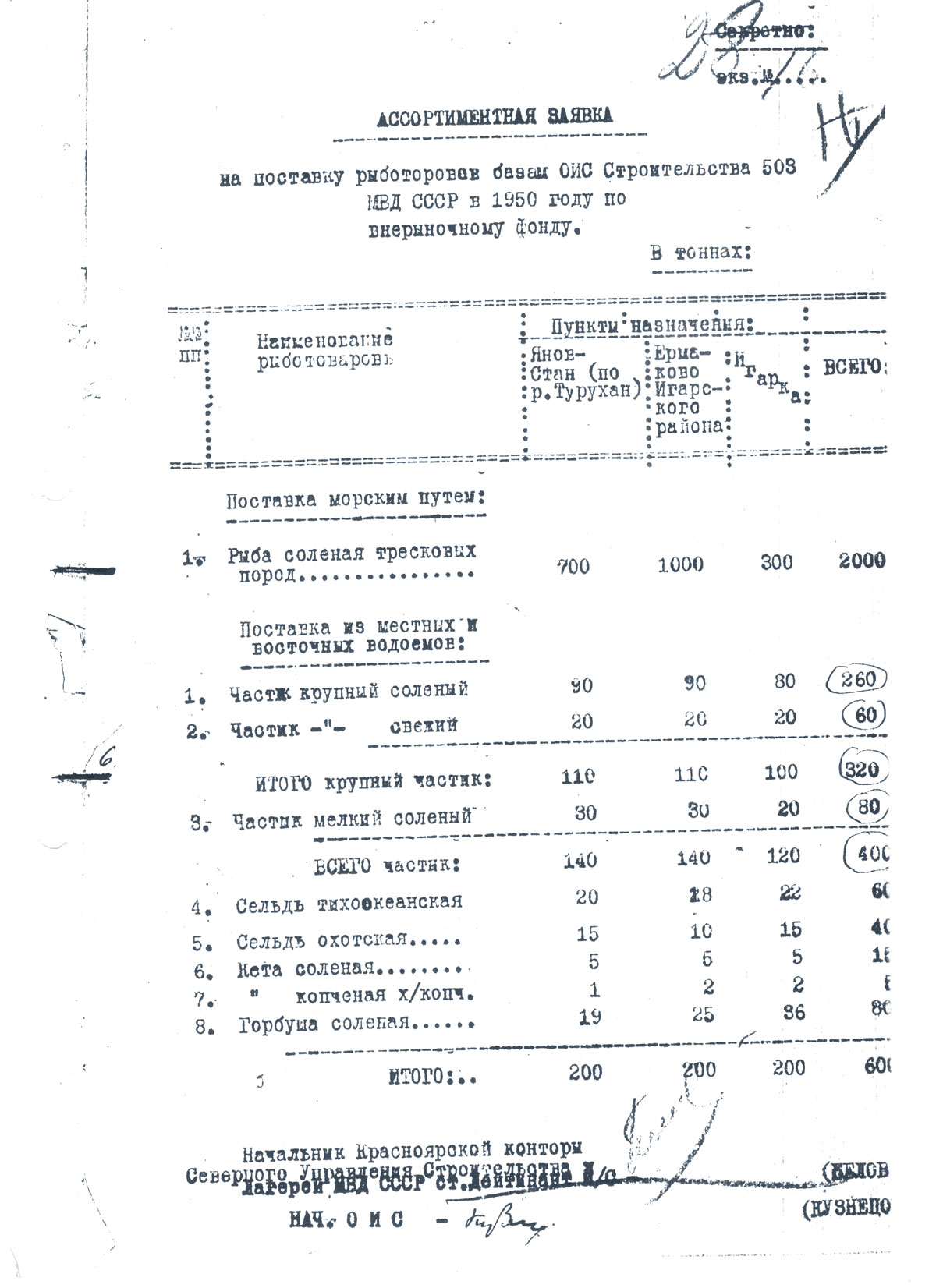 Ассортиментная заявка на поставку рыботорговым базам ОИС Строительства 503 МВД СССР в 1950 году по внерыночному фонду