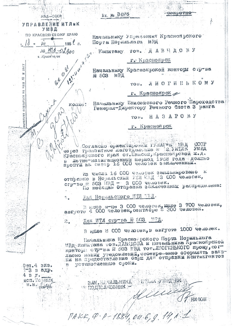 Начальника Красноярского Порта Норильлага МВД капитана тов. ДАВЫДОВА и начальника Красноярской конторы стр-ва № 503 МВД тов. ЛИОГИНЬКОГО прошу, согласно наших уведомлений, своевременно оформить заявки на предоставление барж для отправки на предоставление барж для отправки контингентов в установленные сроки.
