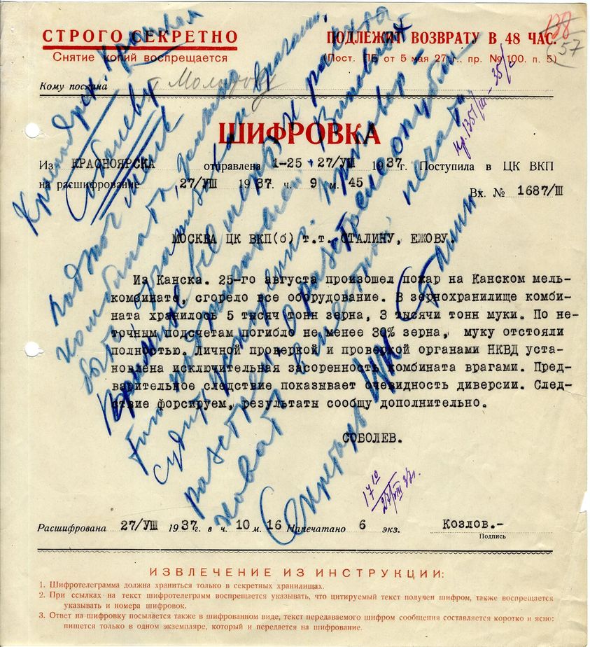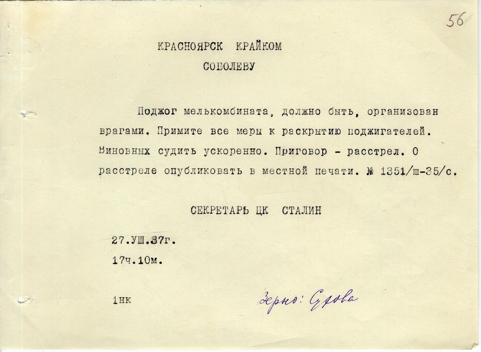 «Красноярск. Крайком. Соболеву. Поджог мелькомбината, должно быть, организован врагами. Примите все меры к раскрытию поджигателей. Виновных судить ускоренно. Приговор — расстрел. О расстреле опубликовать в местной печати. Секретарь ЦК Сталин. 27.08.1938 г.17 часов, 10 минут».