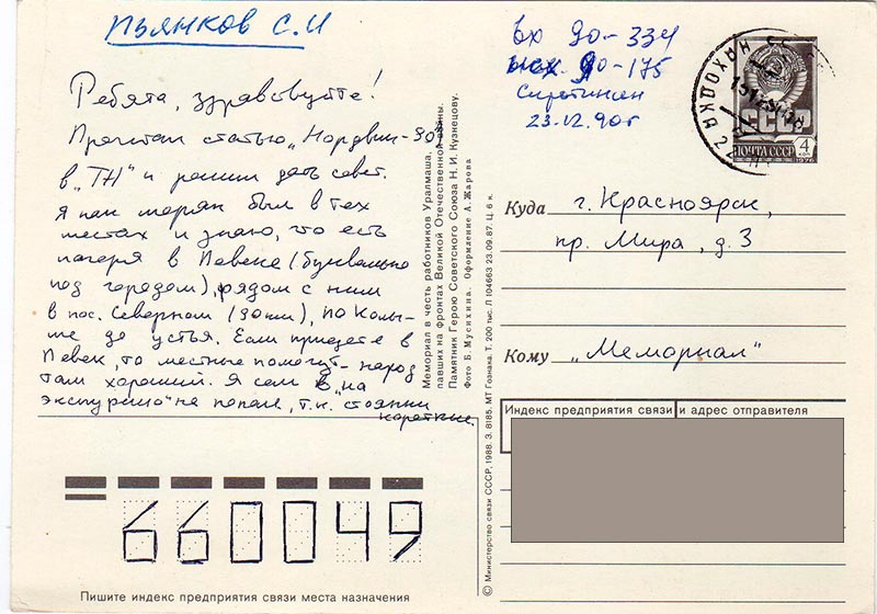Благодарим Наталью Сарченко (и её команду генеалогов) , организовавшую процесс разборки архива писем и его индексацию, Евгения Сазанцева, выполнившего основной объём работ по упорядочению архива писем и его оцифровке, а также Ольгу Куршину за помощь разборке писем.
