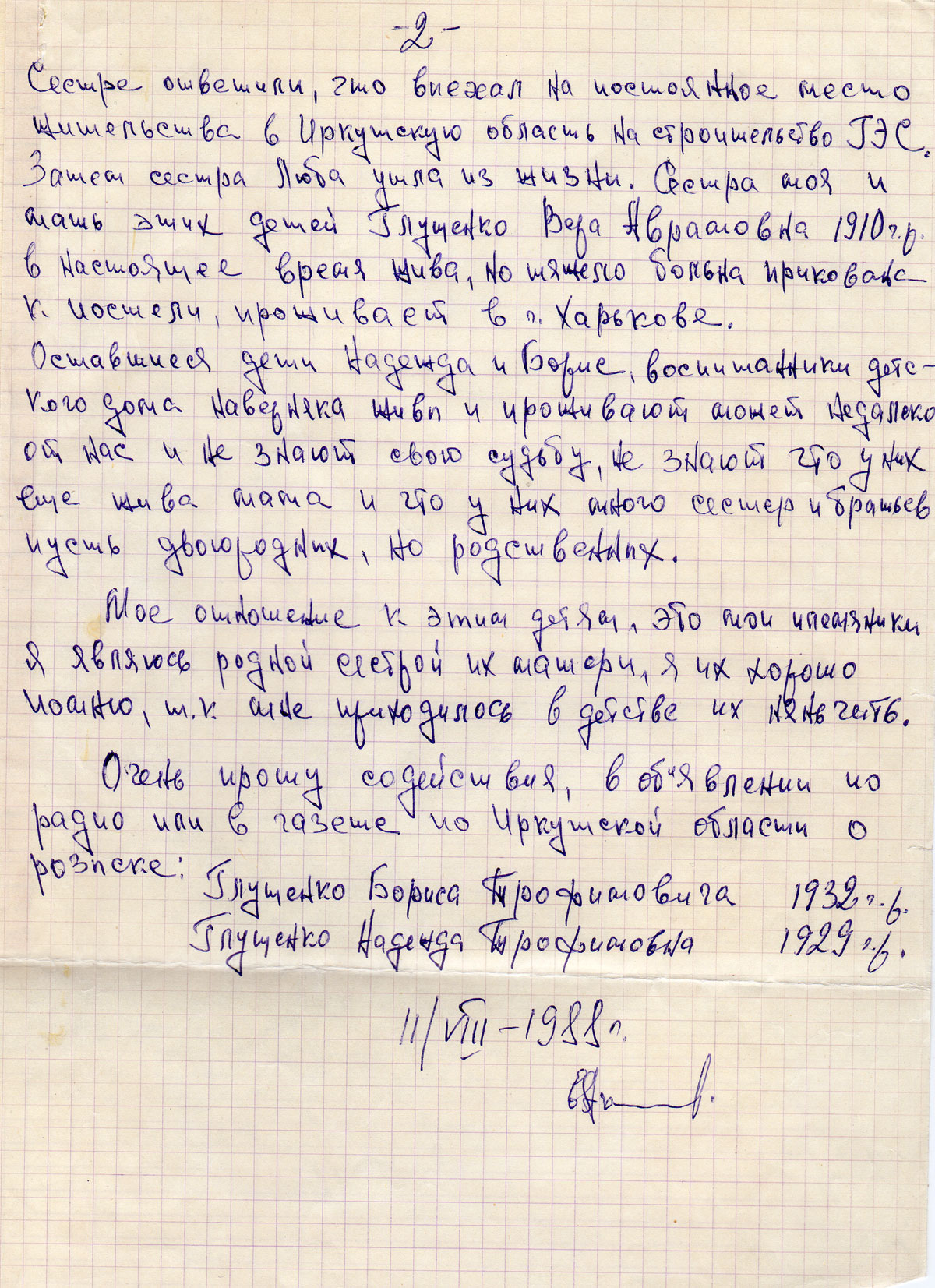 Сестре ответили, что выехал на постоянное место жительства в Иркутскую область на строительство ГЭС. Затем сестра Люба ушла из эизни. Сестра моя и мать этих детей Глущенко Вера Аврамовна 1910 г.р. в настоящее время жива, но тяжело больна, прикована к постели, проживает в Харькове.