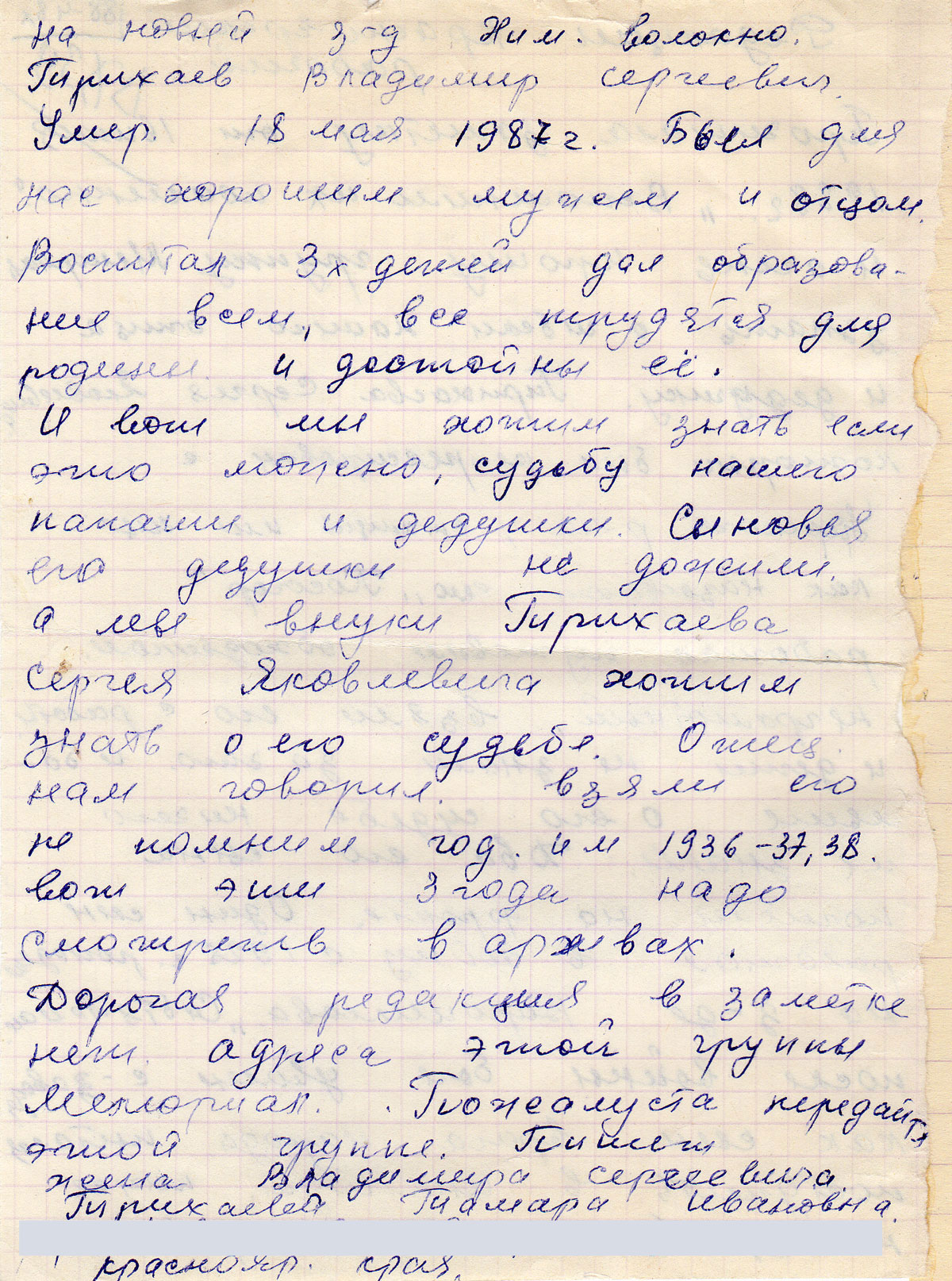 Прочитала заметку от 16 июля 1988 г. «Вспомним их поименно» и очень прошу группу Мемориал узнать о гибели нашего отца и дедушки.
