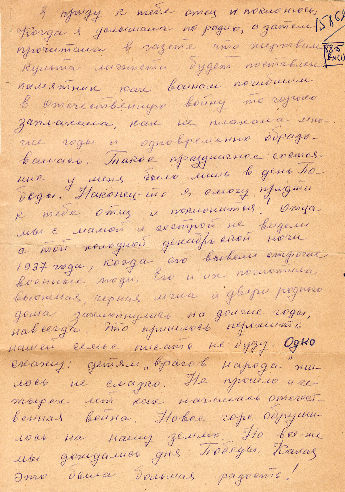 Я приду к тебе отец и поклонюсь. Когда я услышала по радио, а затем прочитала в газете что жертвам культа личности будет поставлен памятник как воинам погибшим в Отечественную войну то горько заплакала, как не плакала многие годы и одновременно обрадовалась. Такое праздничное состояние у меня было лишь в день Победы. Наконец-то я смогу придти к тебе отец и поклонится! Отца мы с мамой и сестрой не видели с той холодной декабрьской ночи 1937 года, когда его вывели строгие военные люди. Его и их поглотила вьюжная, черная мгла и двери родного дома захлопнулись на долгие годы, навсегда. Что пришлось пережить нашей семье писать не буду. Одно скажу: детям «врагов народа» жилось не сладко. Не прошло и четырех лет как началась отечественная война. Новое горе обрушилось на нашу землю. Но все-же мы дождались дня Победы. Какая это была большая радость!