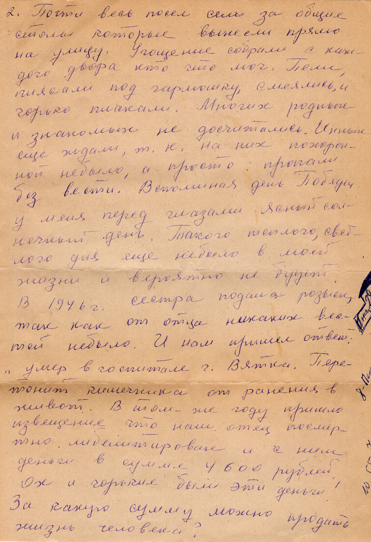 В 1946 г. сестра подала розыск, так как от отца никаких вестей небыло. И нам пришел ответ: «умер в госпитале г. Вятки. Перитонит кишечника от ранения в живот. В том-же году пришло извещение что наш отец посмертно либелитирован и с ним деньги в сумме 4600 рублей. Ох и горькие были эти деньги!