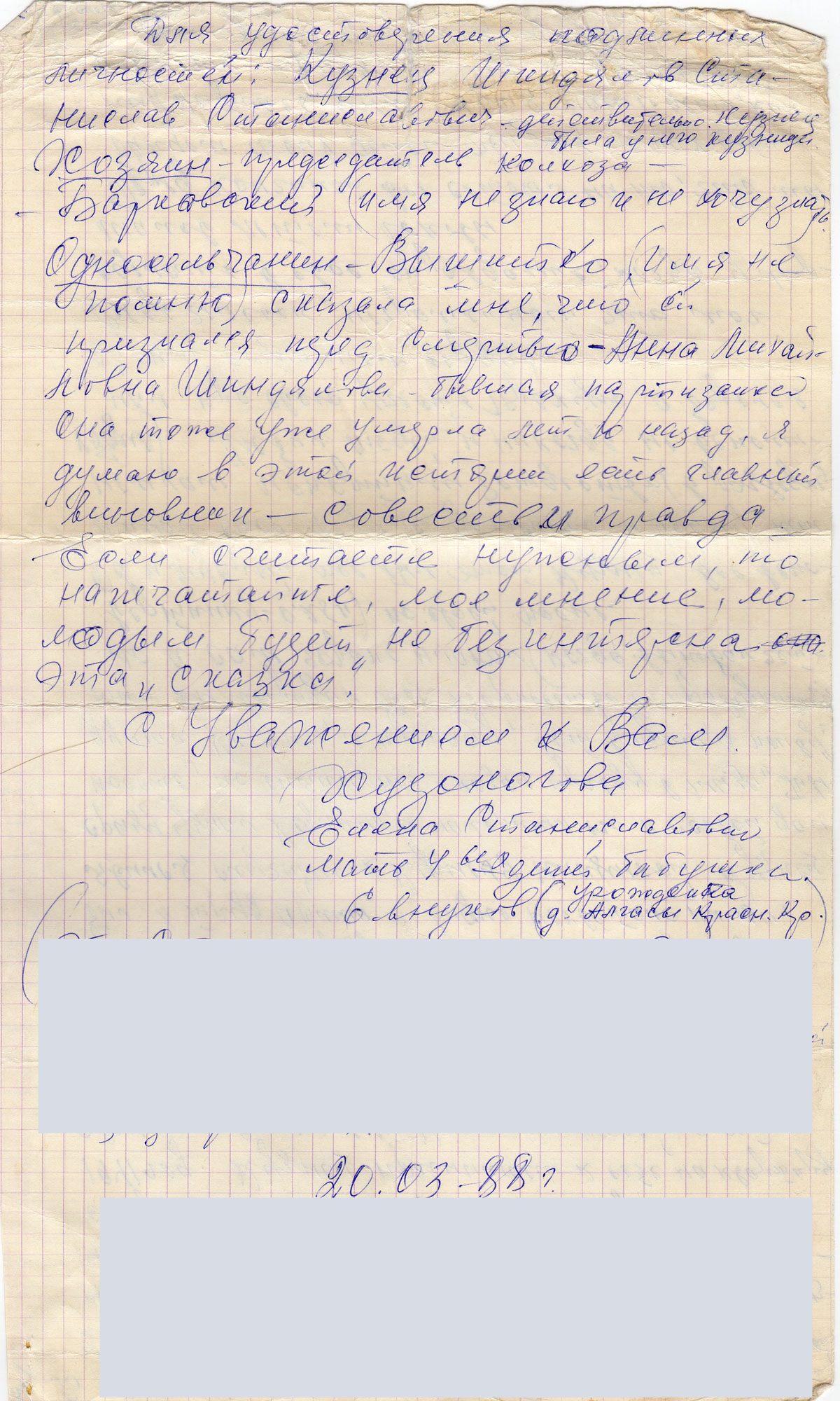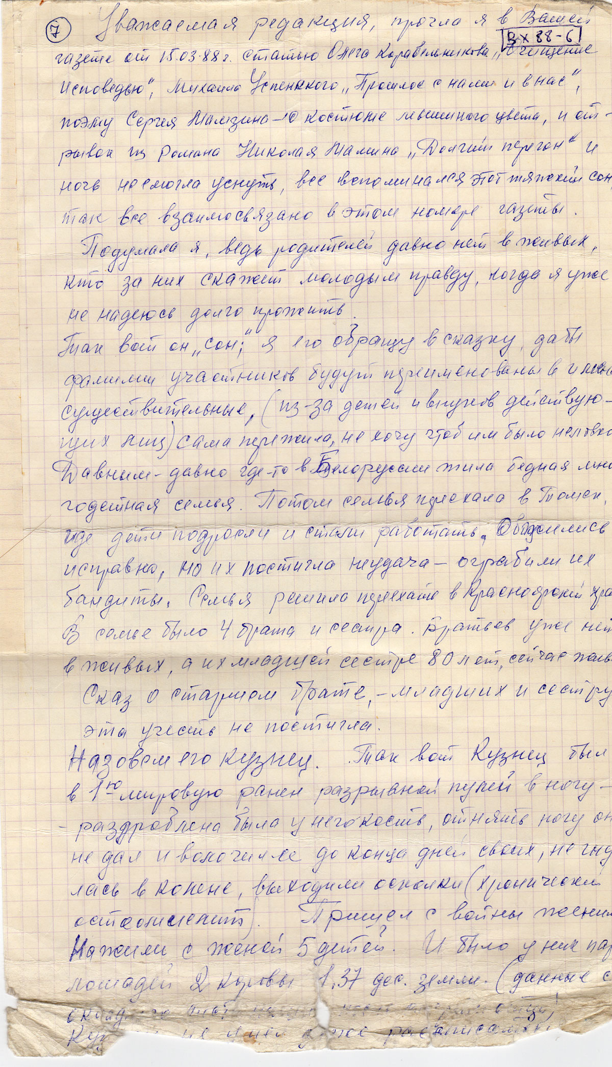 Уважаемая редакция, прочла я в Вашей газете от 15.03.88 г. статью Олега Корабельникова «Очищение исповедью», Михаила Успенского «Прошлое с нами и в нас», поэму Сергея Мамзина о костюме мышиного цвета, и отрывок из романа Николая Мамина «Долгий перегон» и ночь не смогла уснуть, все вспоминался этот тяжкий сон, так все взаимосвязано в этом номере газеты.