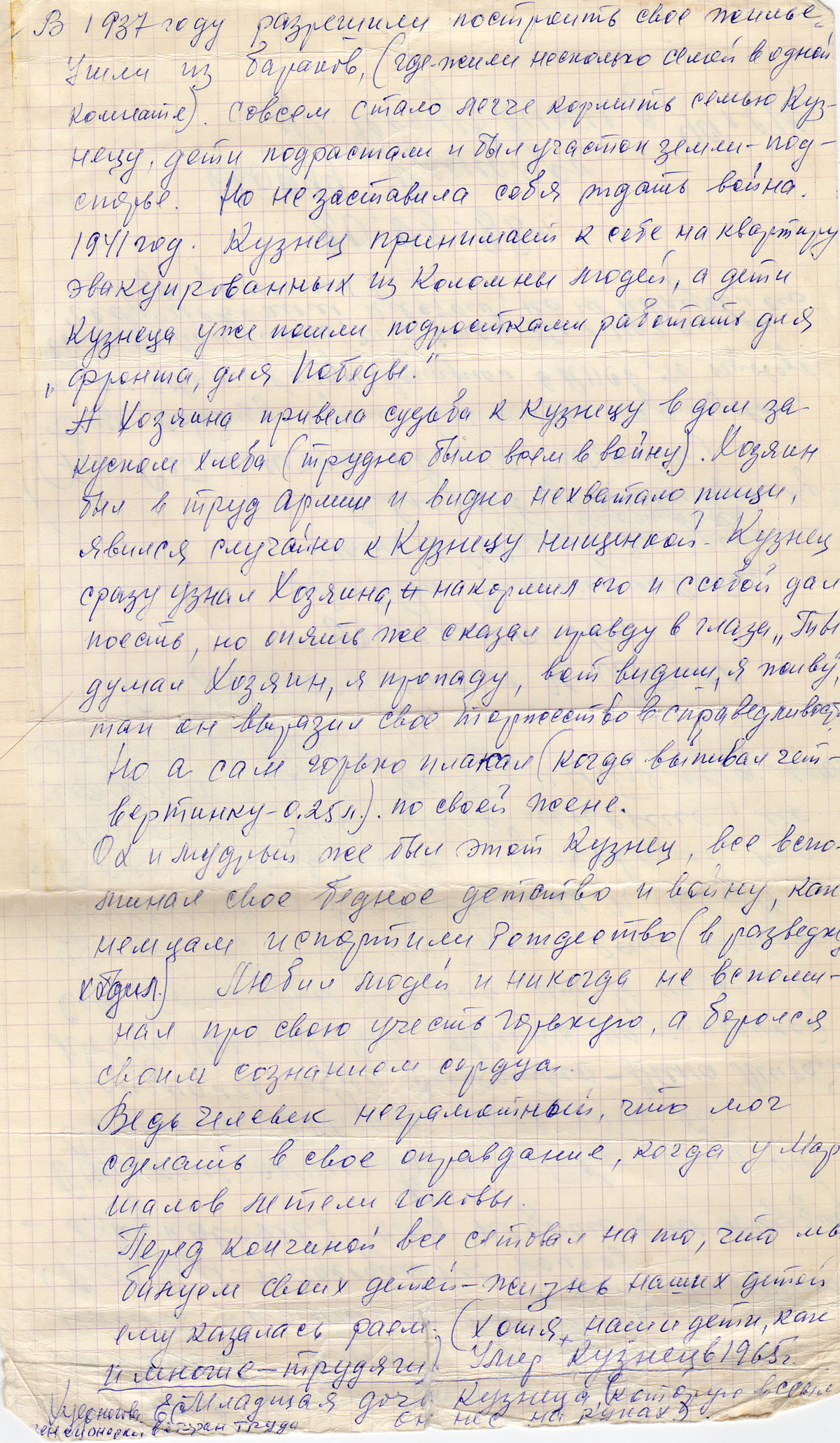 В 1937 году разрешили построить свое жилье ушли из бараков, (где - жили несколько семей в одной комнате). Совсем стало легче кормить семью Кузнецу, дети подрастали и был участок земли – подспорье. Но не заставила себя ждать война. 1941 год Кузнец принимает к себе на квартиру эвакуированных из Коломны людей, а дети Кузнеца уже пошли подростками работать для «фронта, для Победы».